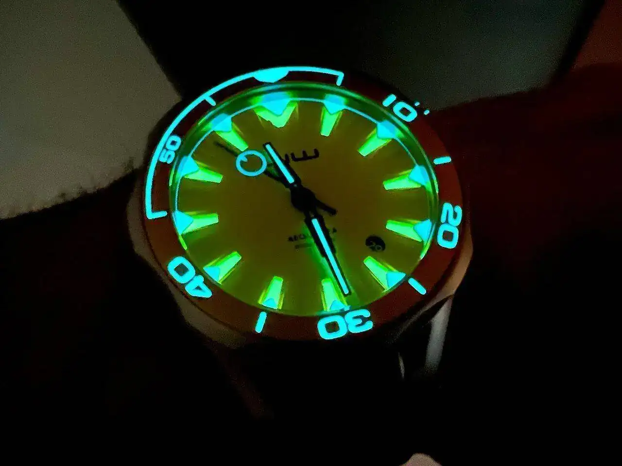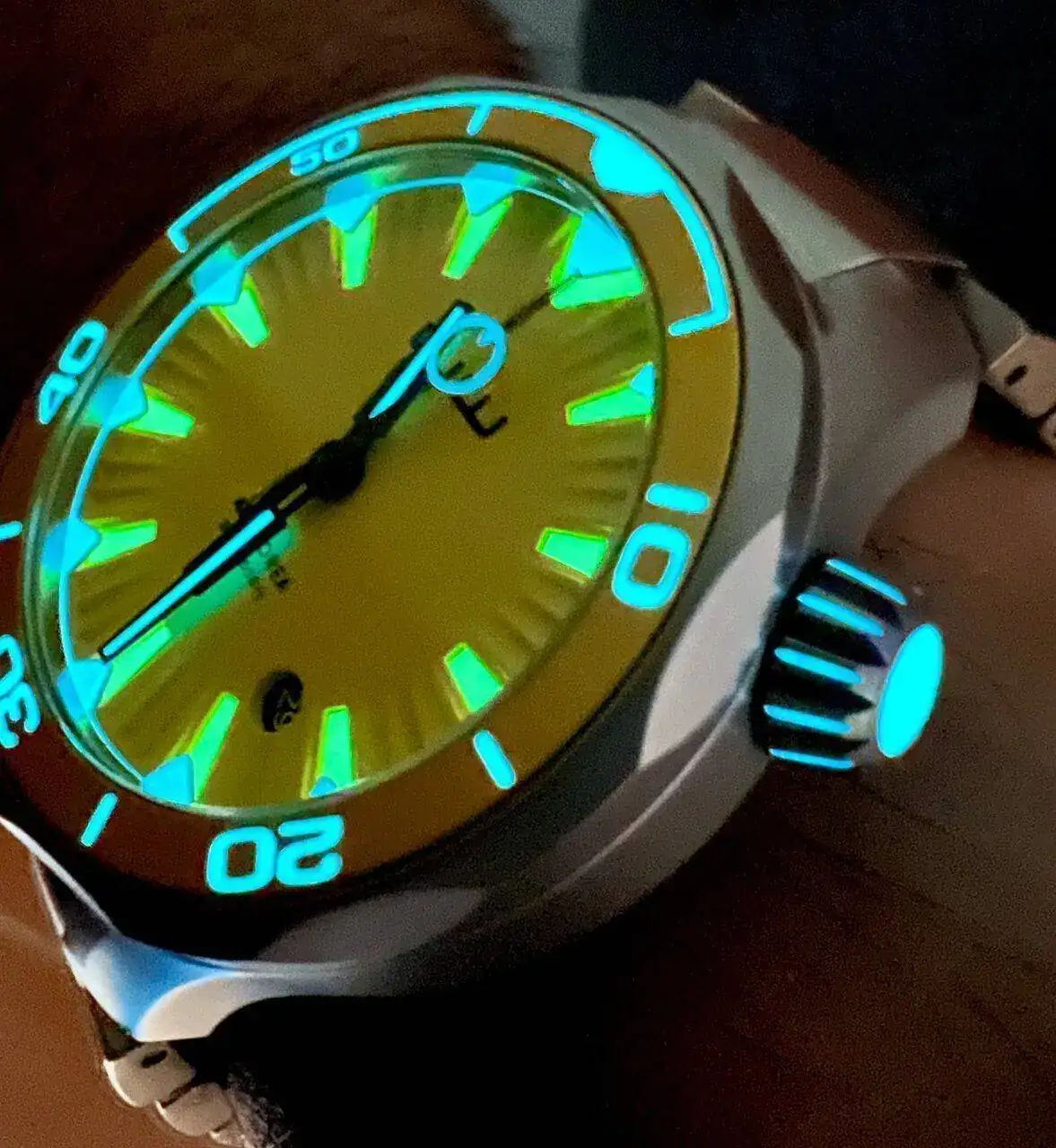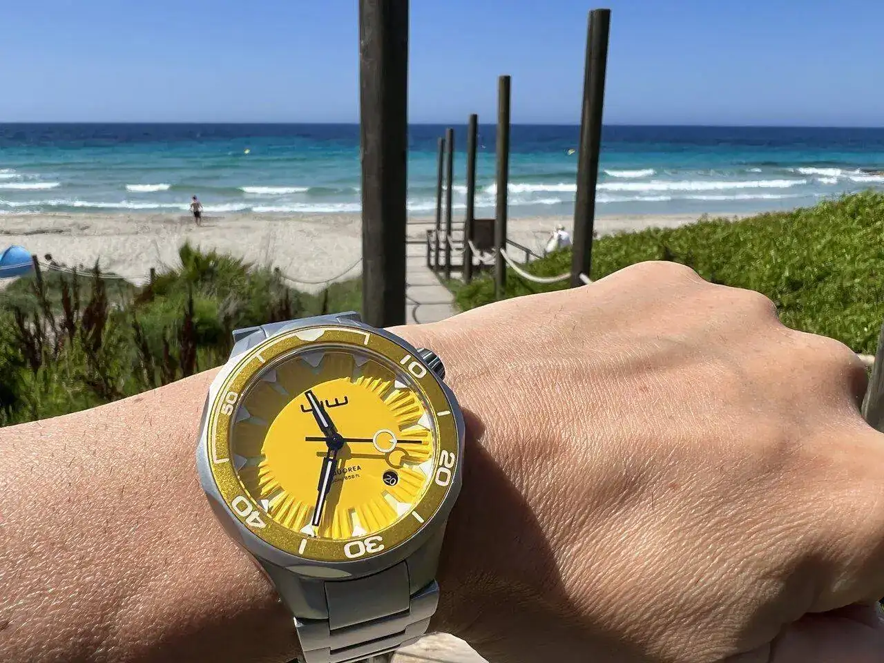 El bisel incorpora un insert de aluminio que, en el caso del que lleva el dial amarillo, es de un dorado oscuro que liga muy bien con el color principal. Gira firme pero sin sobresaltos y sin ningún tipo de juego: