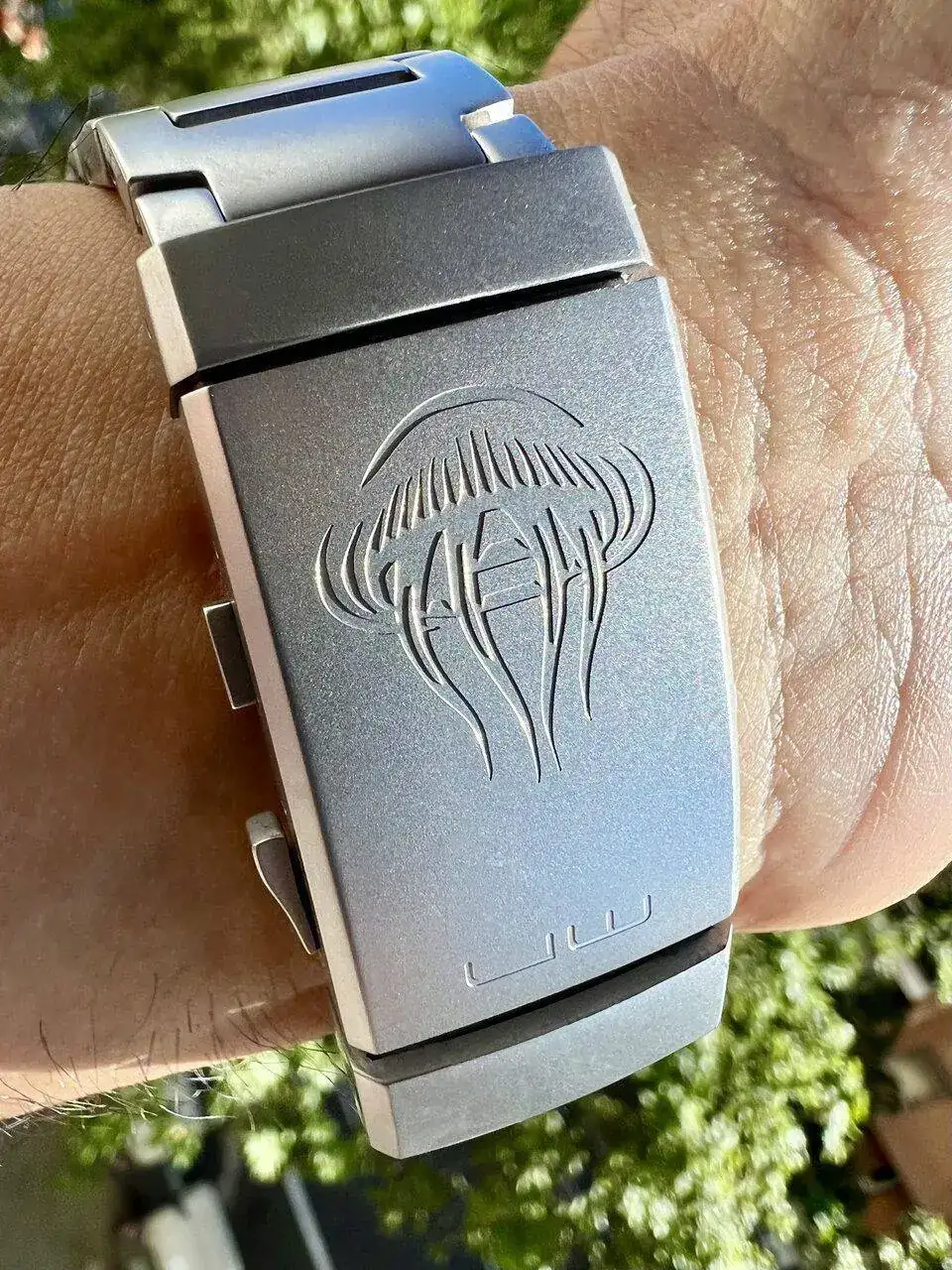 El brazalete es igual de suave por dentro que por fuera, y su forma sigue el patrón general bio. Eso sí, sus endlinks impiden cambiarlo por otras opciones, algo que a mi no me importa porque no me gusta cambiarlos. El cierre es de nuevo el sospechoso habitual, regulable al vuelo, detalle que se agradece mucho en verano. El bajorrelieve (nada de marcaje laser) de la medusa le da un aire simpático: