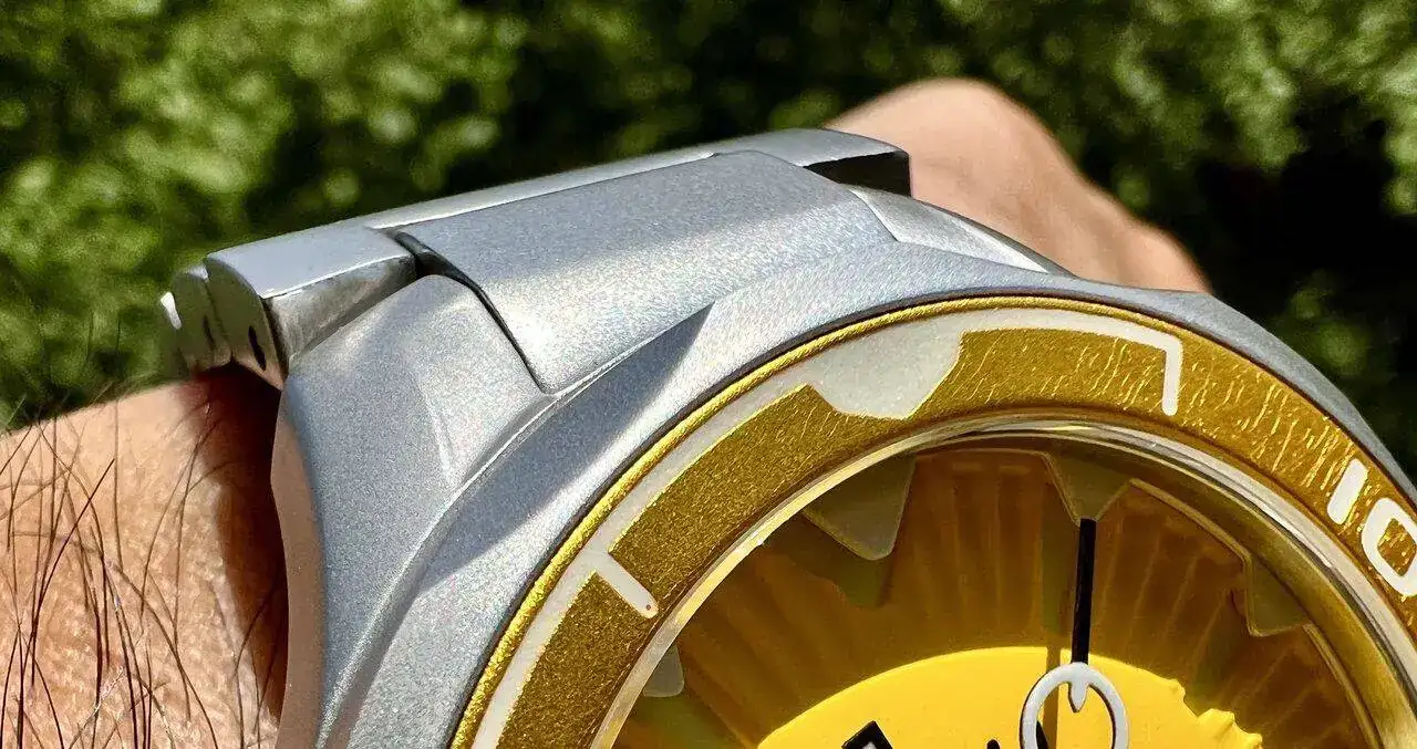 Se puede observar que el diseño general recuperaba ciertos aspectos de esa fiebre por las formas orgánicas que tomó por asalto a todo tipo de objetos en la década de los '90: coches, electrodomésticos, muebles, gafas... y relojes. Pero lo hacía de un modo más actualizado, más potente, por decirlo de un modo gráfico. De los 5 colores disponibles inicialmente (posteriormente se añadieron otros 2 por votación popular al haber alcanzado el primer objetivo económico) mis ojos de urraca se posaron en... ¡acertásteis! El amarillo, maldita sea mi estampa... 😂