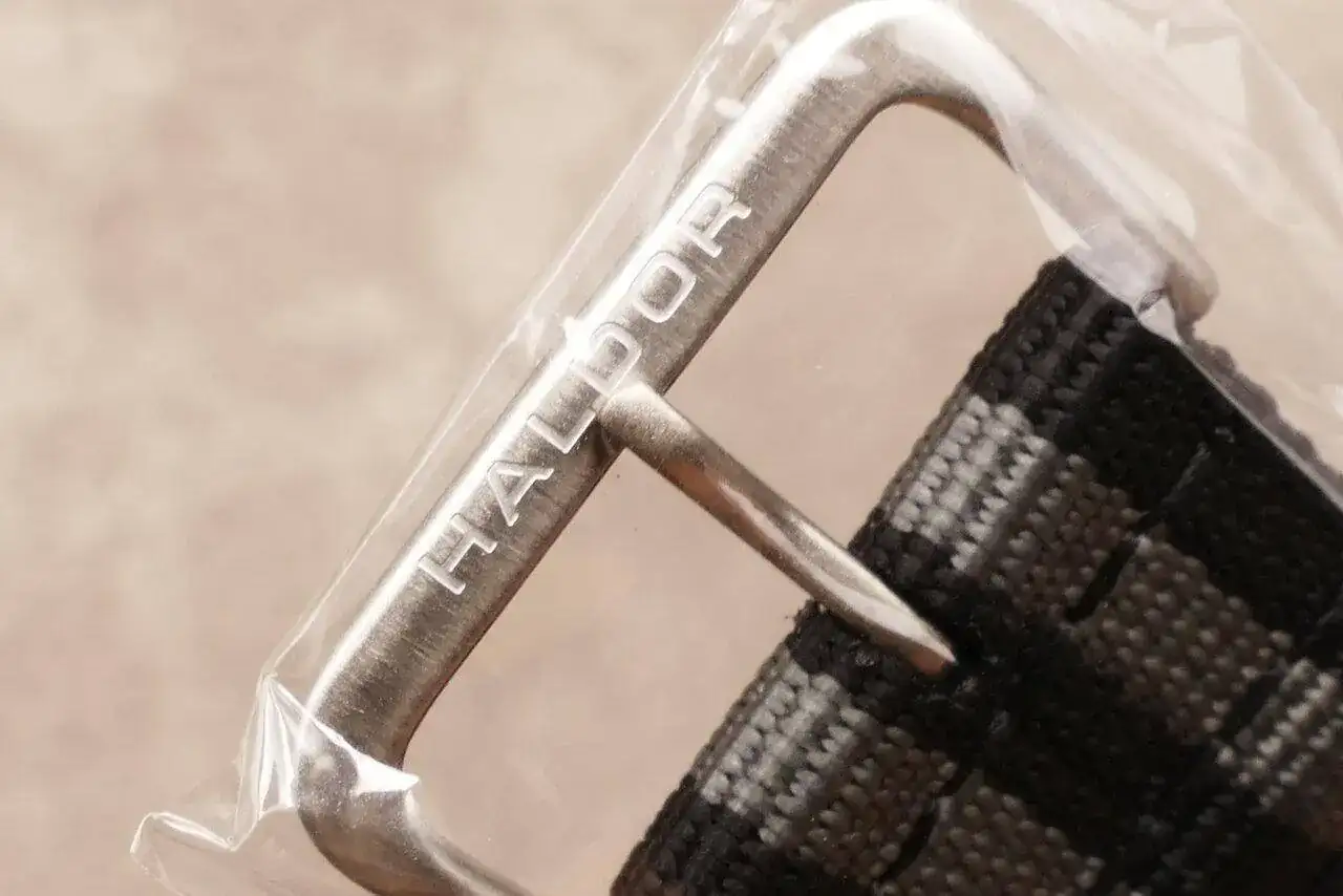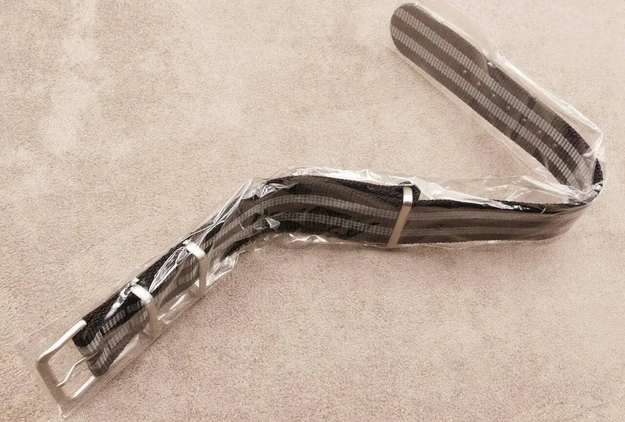 Los accesorios son una correa tipo nato de buena calidad estilo James Bond, con herrajes de acero cepillado y cuyo ardillón va firmado en bajorrelieve: