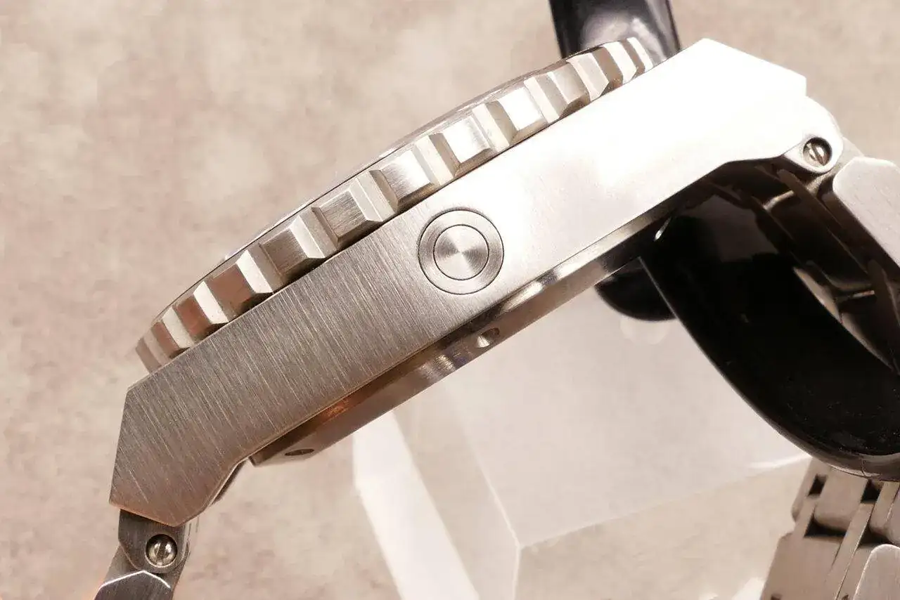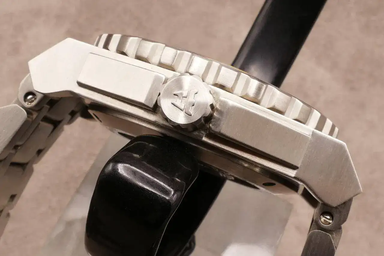 La mecanización del bloque es excelente, sin lugar a dudas. Porque a pesar de su apariencia brutalista, los acabados son impecables. Los ángulos son perfectos, las aristas están bien rematadas, el cepillado de las superficies es irreprochable. Su diseño geométrico de estructura hexagonal le da un aspecto muy industrial. El lado derecho de la caja tiene unos protectores de corona angulares que mantienen la gran corona roscada de 7,5 mm a salvo de golpes: