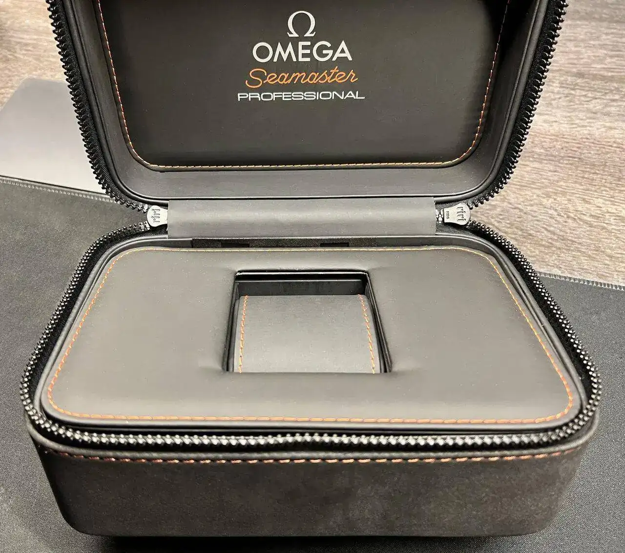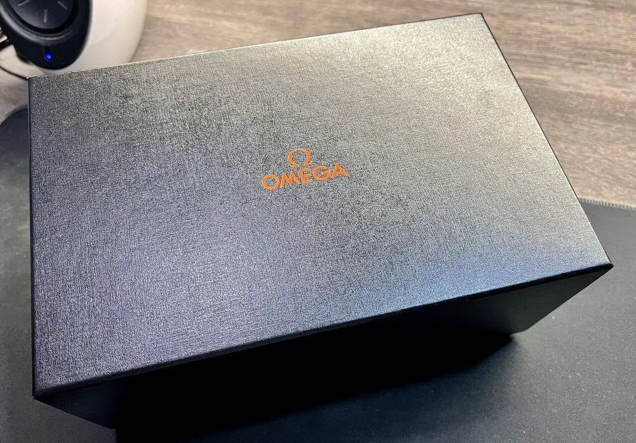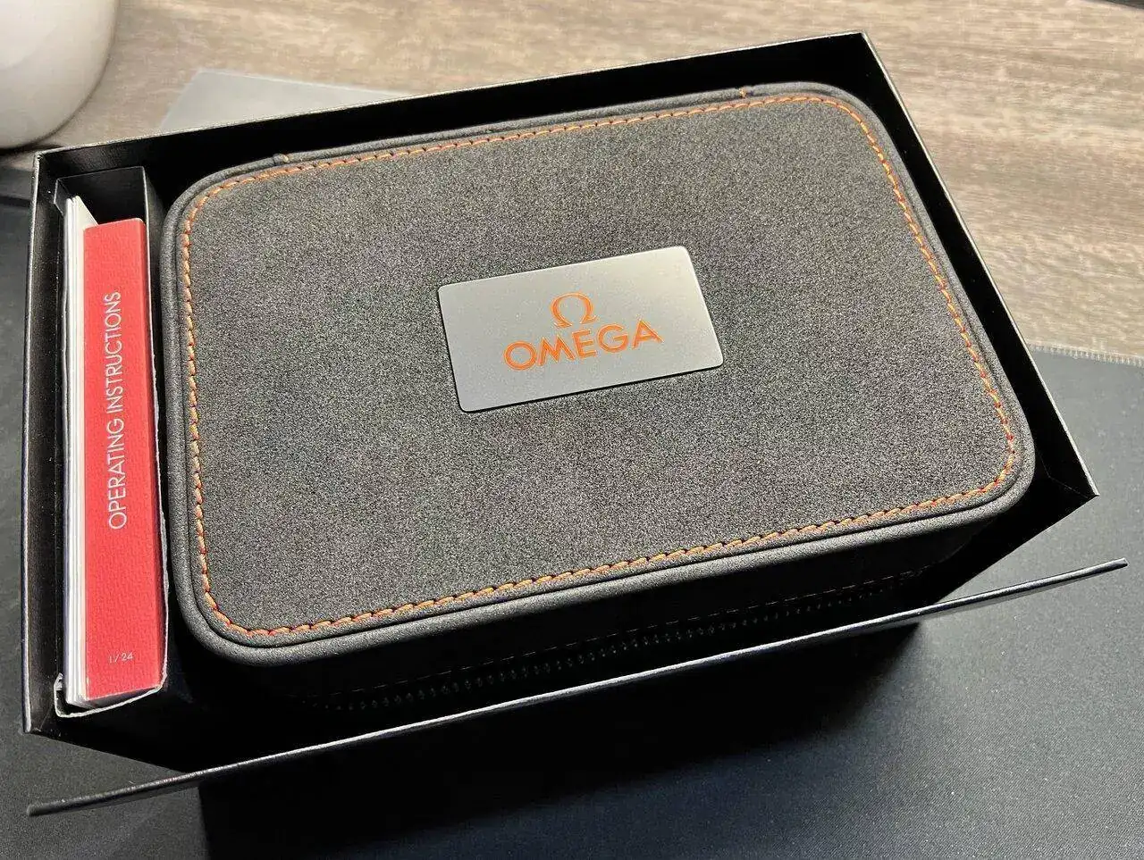 El estuche está realizado en un símil de neopreno negro en acabado mate (que coge toda mota de polvo que existe en el universo conocido, como podéis comprobar en la foto) con pespuntes naranjas y el logo grabado en bajorrelieve, que se abre mediante una cremallera. El interior sigue el estilo del exterior, aunque en acabado satinado. Sorprende la calidad del conjunto que, aunque naturalmente no es la de Omega, aguanta el tipo por el precio estipulado. Y en el centro, el gran (nunca mejor dicho) protagonista, que va acompañado de un sello para darle una apariencia más profesional: