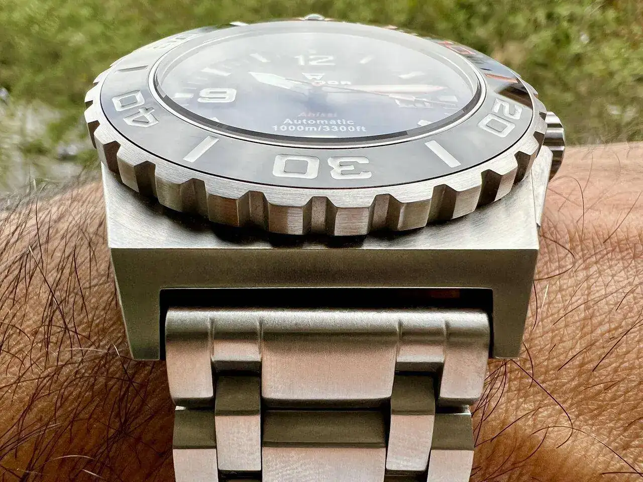 Estamos ante un cuerpo contundente esculpido en un bloque de acero 316L, de 45,5 mm de diámetro y 15,5 mm de grosor. Si bien ciertamente hay relojes más grandes por ahí, este se ve y se siente muy grande. Y eso es principalmente por el lug to lug, que es de nada menos que 57 mm. Que sí, que tenéis razón, que me creo que tengo la muñeca del Chuache y no es así (ni su cuenta corriente... 😬). Pero uno debe ser fiel a sus principios, y uno de los míos es "si te apetece, dale". Y además hay un punto a su favor: prácticamente no tiene asas ya que están integradas, por lo que en mi muñeca queda al límite en ambos extremos... o eso me quiero vender a mi mismo. 😇