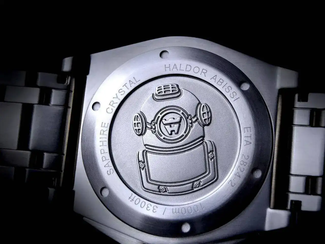 Como buen diver, el Abissi se cierra por detrás mediante una gruesa tapa a rosca que contiene un precioso bajorrelieve de un casco y peto de buzo a la vieja usanza. Sencillo, rudo, pero muy bien realizado, y personalmente es de los fondos que más me gustan por su simplicidad bien marcada.