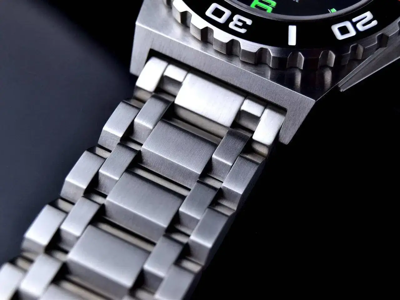 La forma de la caja me encanta. Esa forma de rombo, cortado de tal manera que parece integrar al brazalete es estupenda al alejarse de la clasica forma redonda de casi todos los diver. Es de agradecer que, aún tomando inspiración de algún elemento del Plo-Prof, no haya habido intención de querer versionar al OMEGA y sí, en cualquier caso, de tratar de emularlo.