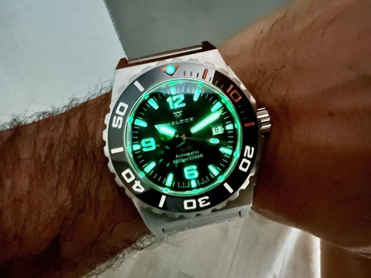 El diseño del dial está bien muy bien ejecutado y es tremendamente fácil de leer, algo esencial en un diver. Es negro mate, con grandes índices y números aplicados, fabricados en metal y con abundante lumen. Otro detalle controvertido es la presencia de un datario, que ya sé que es como el tema de "cebolla sí / cebolla no" en la tortilla de patatas (por cierto, me gustan ambas, pero la prefiero sin...). Situado a las tres, dicha ubicación mantiene la tan apreciada simetría del dial por aquellos que sufren ciertos TOC's, siendo además el fondo blanco con las cifras en negro.