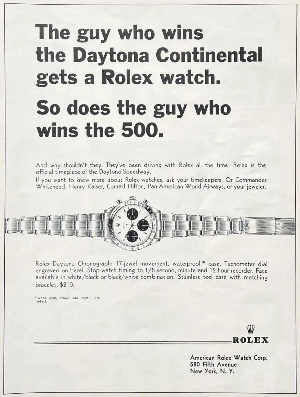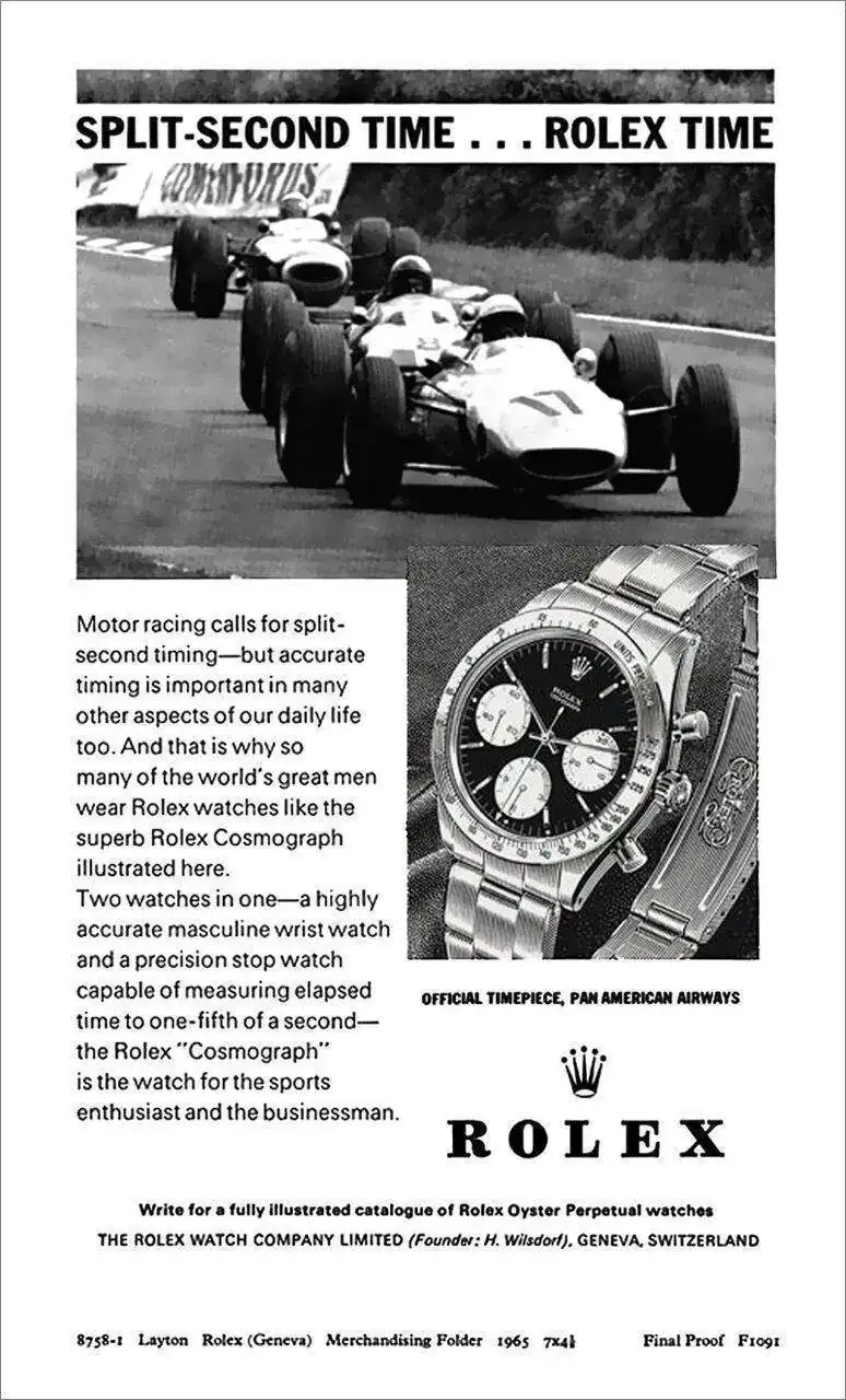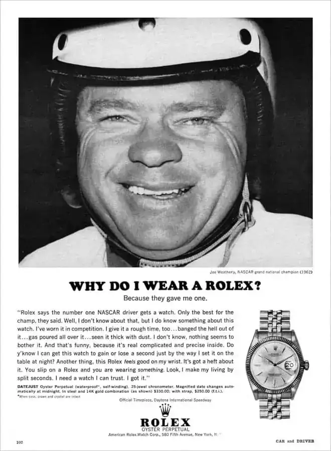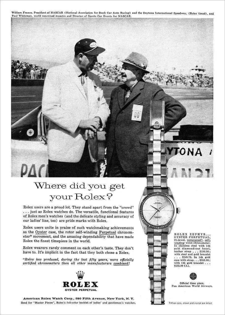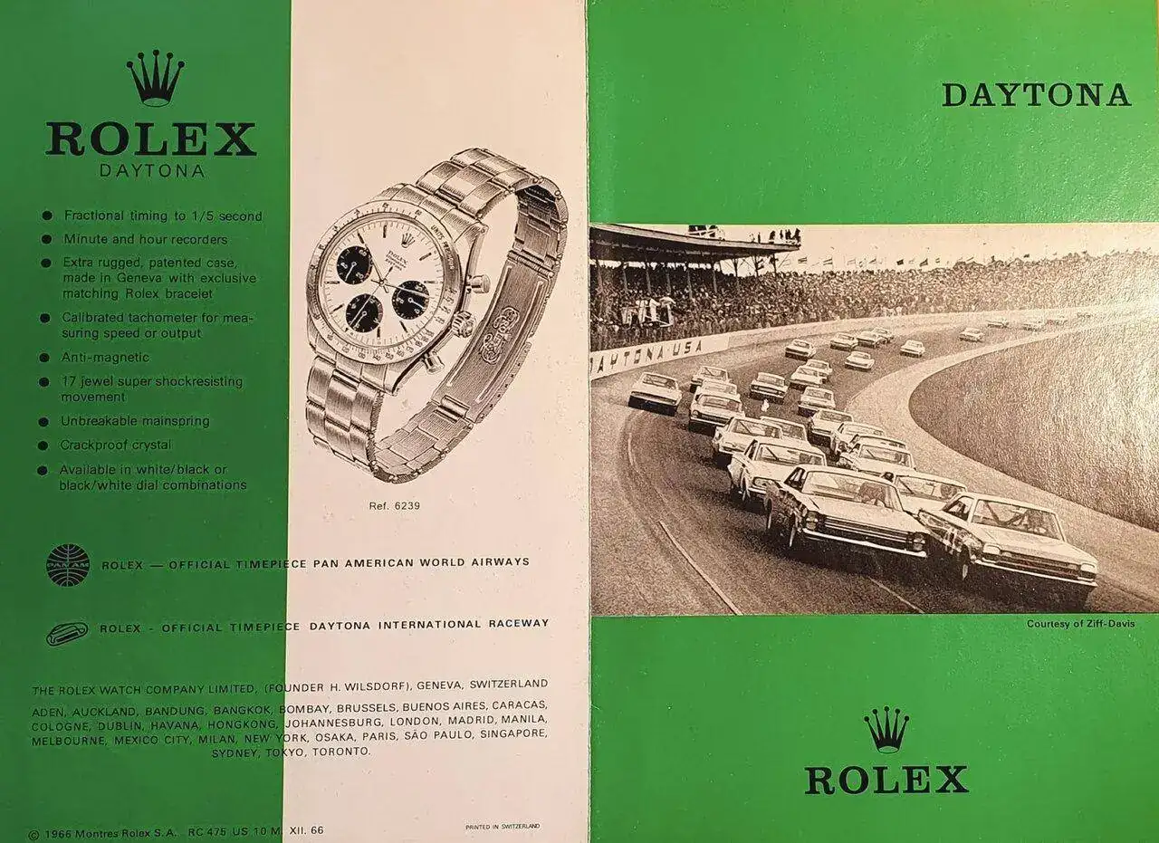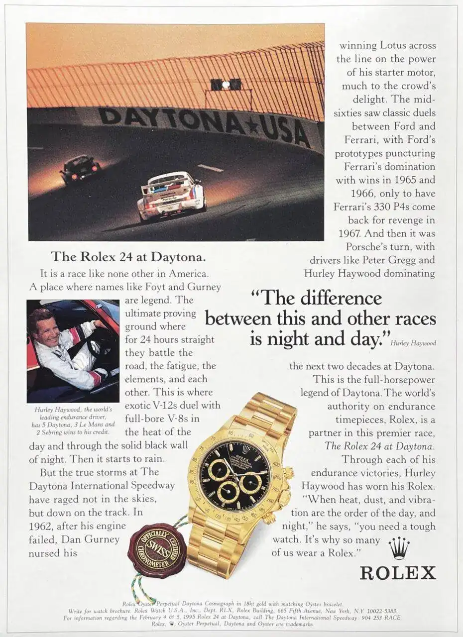 Gracias al acuerdo con Rolex, los vencedores de las 500 Millas de Daytona empezaron a recibir un reloj de la marca como regalo, aunque no un Daytona, como podría dar a entender este anuncio...