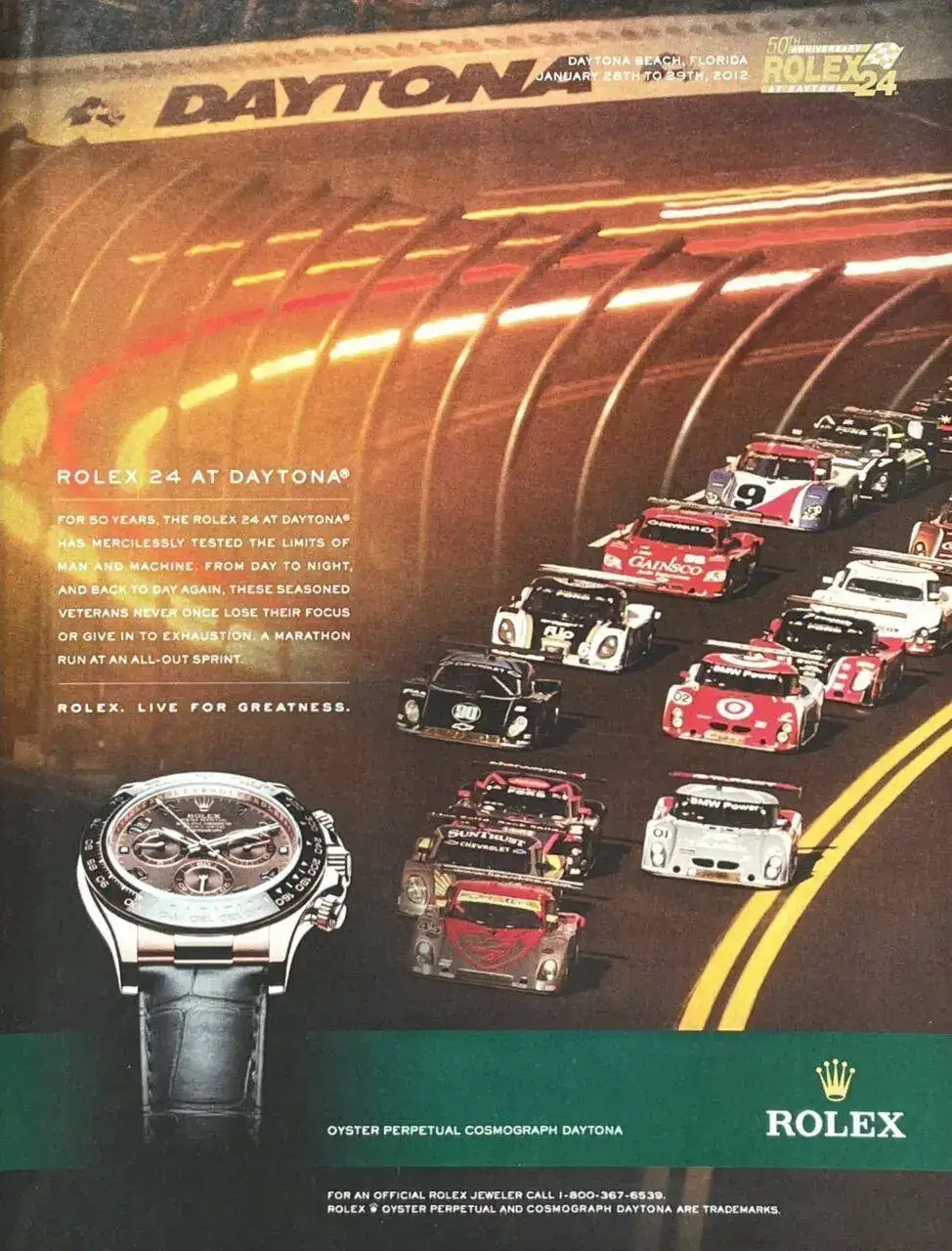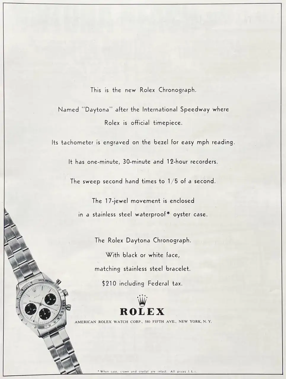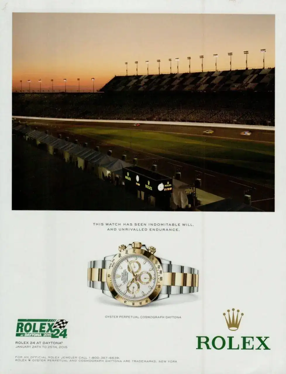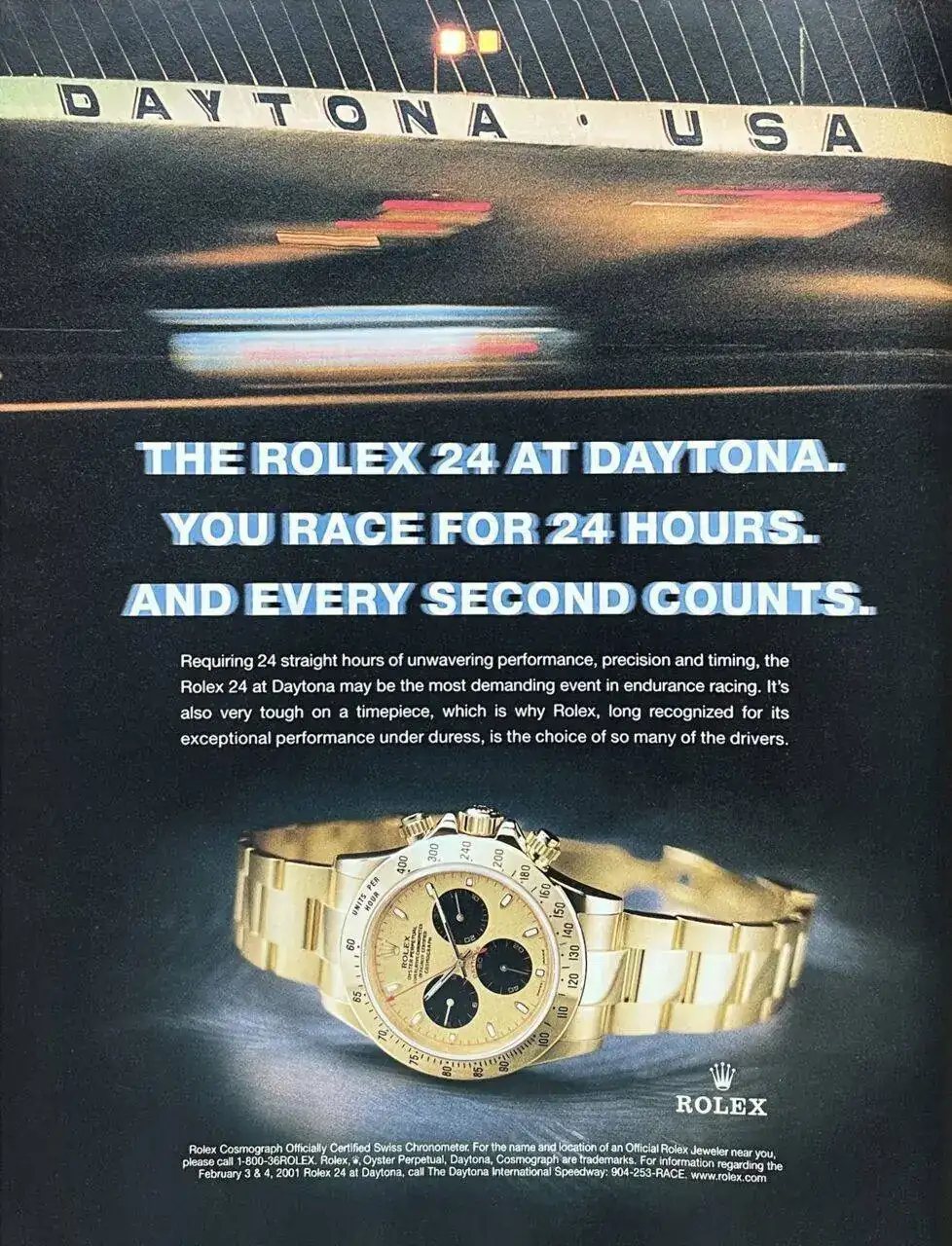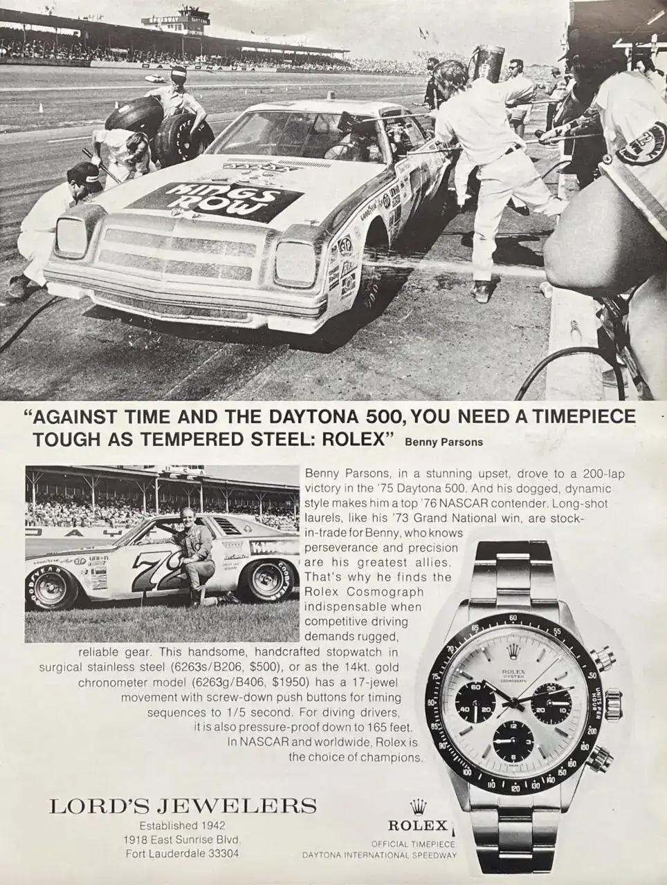 Gracias al acuerdo con Rolex, los vencedores de las 500 Millas de Daytona empezaron a recibir un reloj de la marca como regalo, aunque no un Daytona, como podría dar a entender este anuncio...