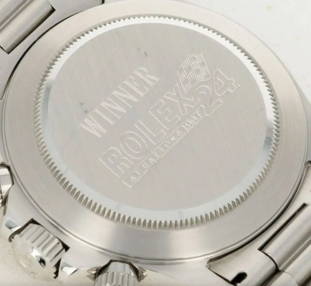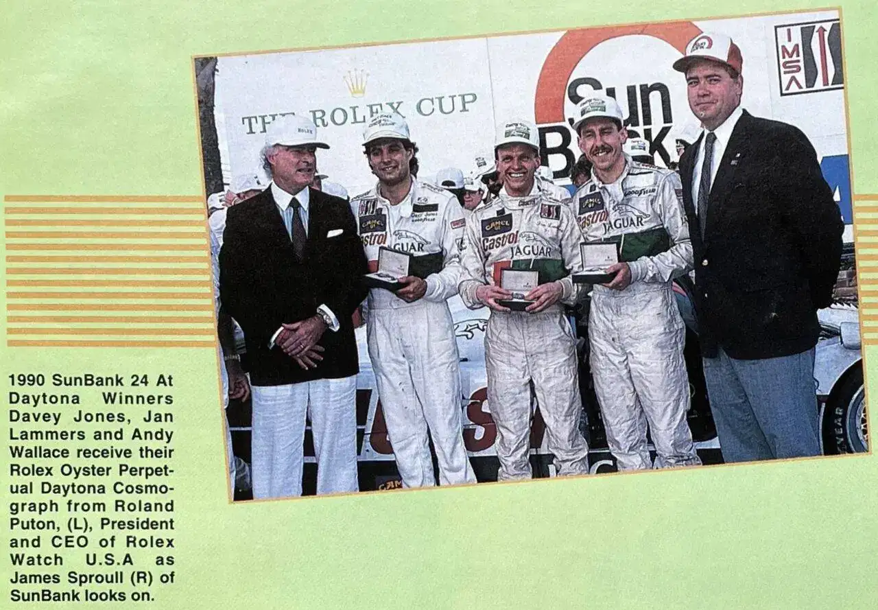 Pero lo más interesante para los pilotos es que, por primera vez, decidió obsequiar a cada uno de los del equipo ganador con un Rolex Daytona. Los primeros afortunados fueron los pilotos del Jaguar XJR-12 Davey Jones, Jan Lammers y Andy Wallace, con sendos Daytona grabados simplemente con la palabra "Winner" (ganador) en la tapa trasera (otro detalle poco habitual por parte de Rolex):