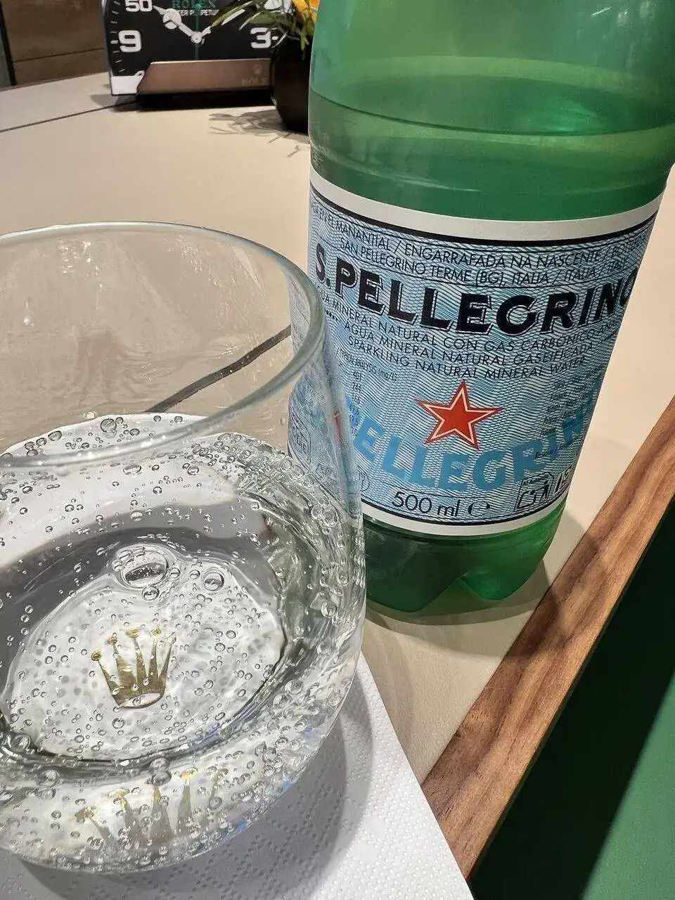Un toque italiano para amenizar la espera del suizo, jugando con la corona de la servilleta a través del fondo del vaso (en un pobre intento de emular a esos artistas de la fotografía que hay en el foro, que hacen maravillas):