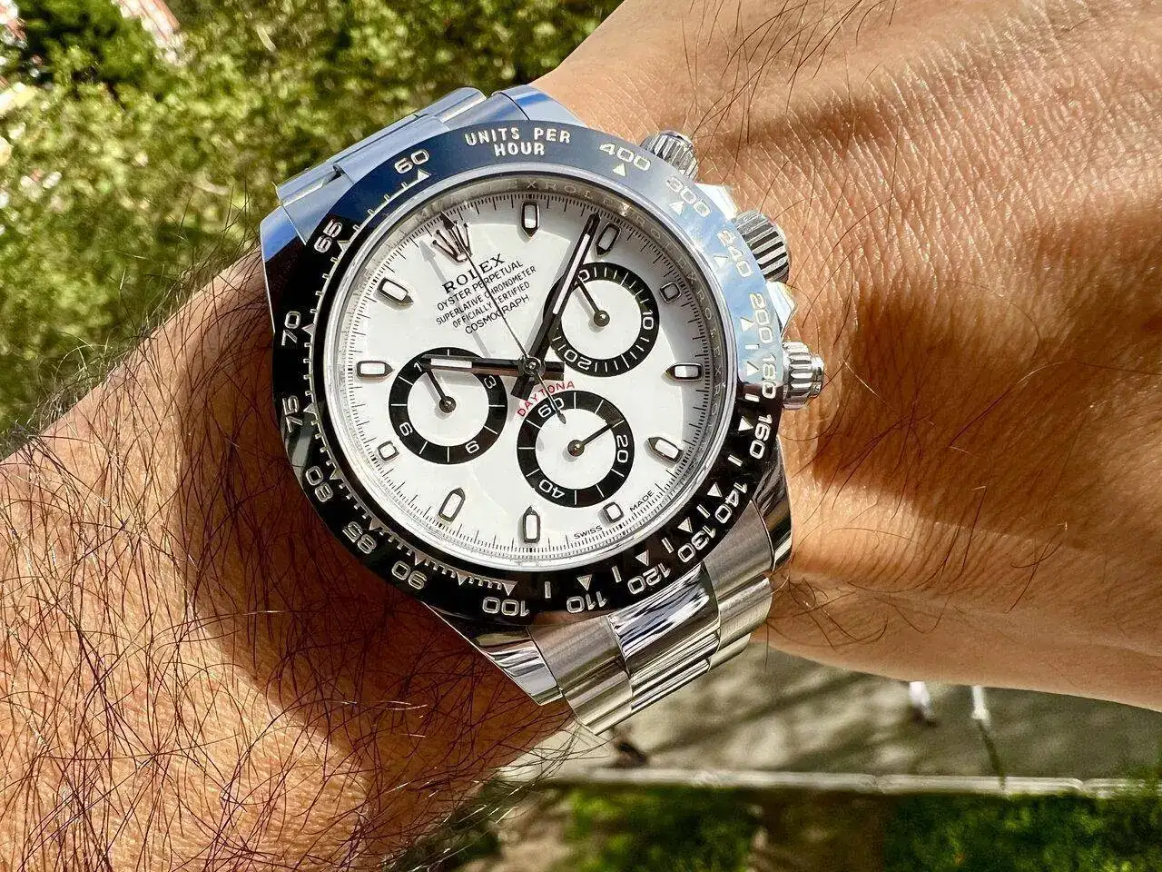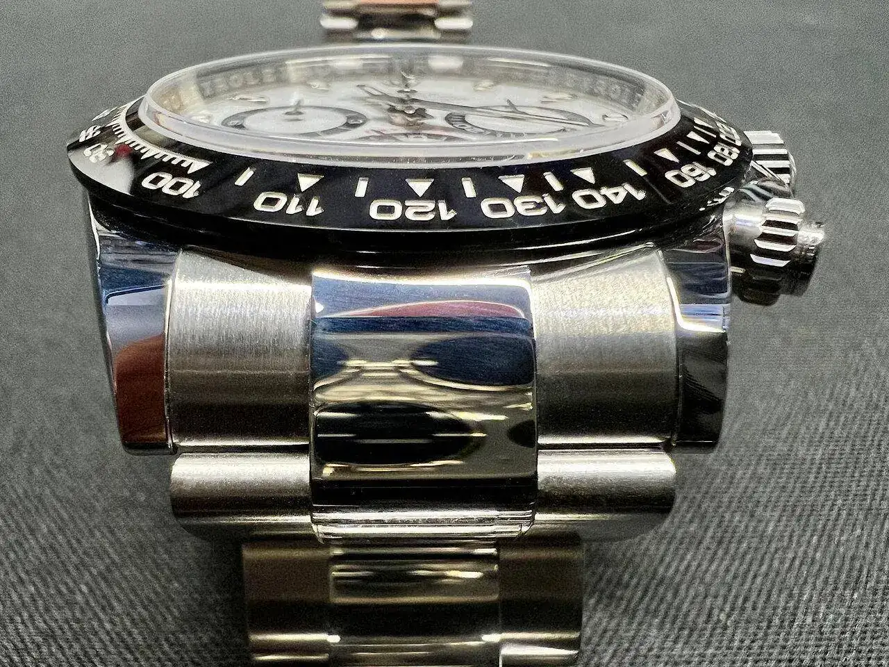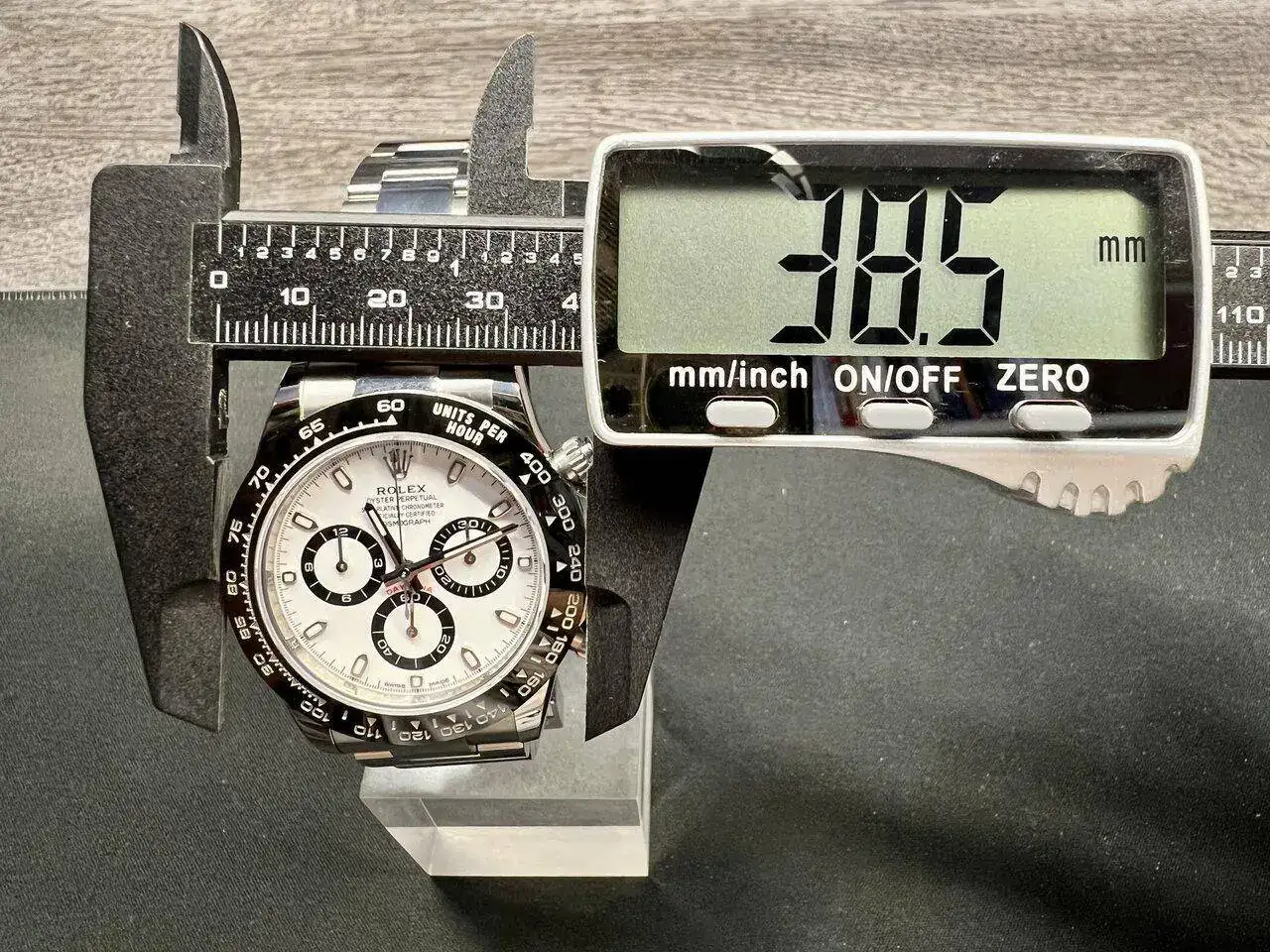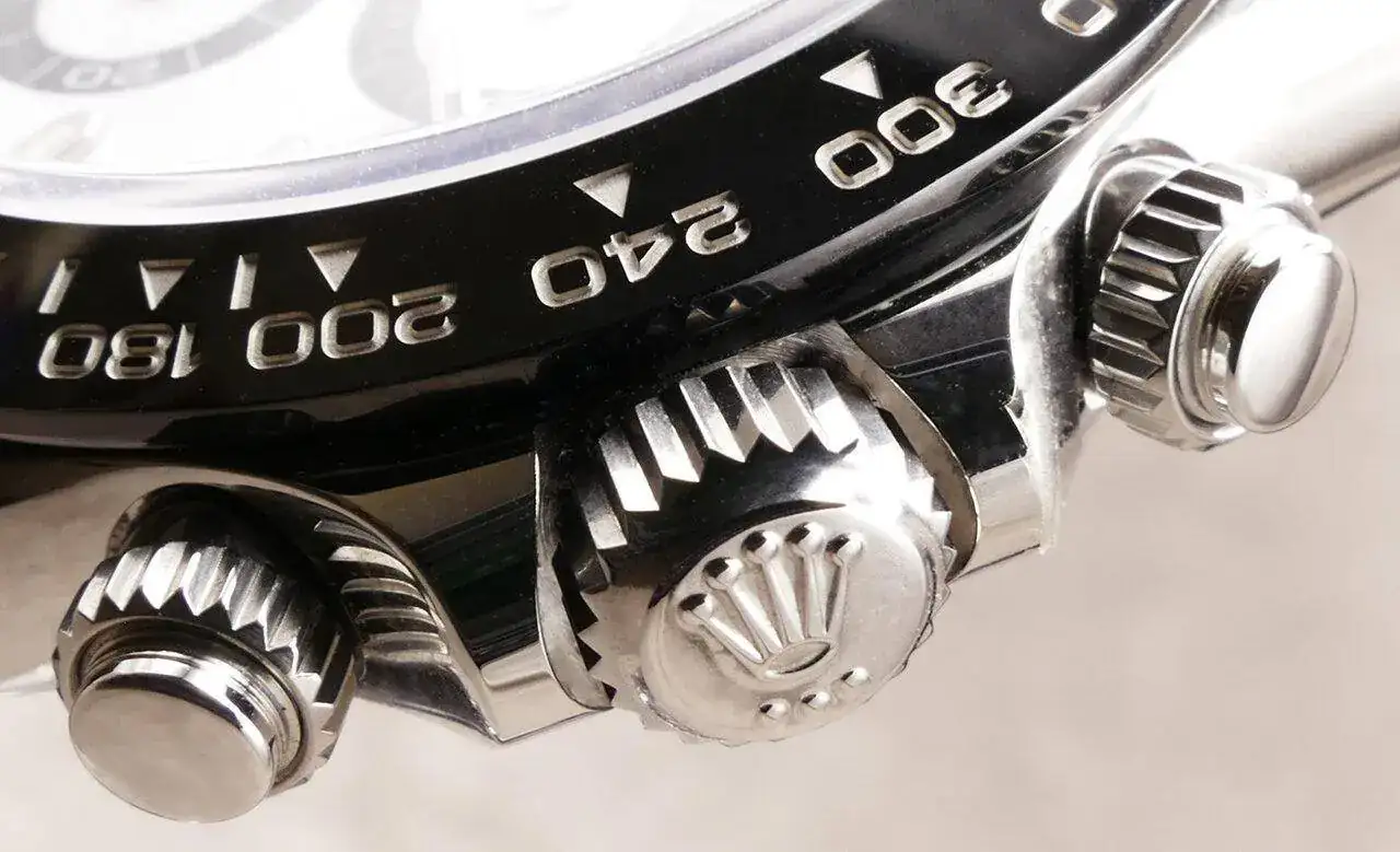 Realizada en acero 904L, como os podéis imaginar, este reloj me parece un poco pequeño. Evidentemente ya lo sabía, he llevado otros Daytona antes, pero sigo pensando que le deberían dar un par de milímetros más de diámetro (sí, ya lo sé, los puristas están ya preparando el cadalso para mi ejecución en plaza pública... 😬). Porque por mucho que se diga que es de 40mm, en realidad es de 38,5mm. Quizás da la impresión de tener un mayor tamaño por el dial blanco y por toda la botonería propia de un crono, pero la cifra es la que es: