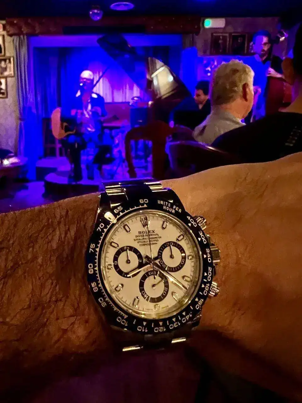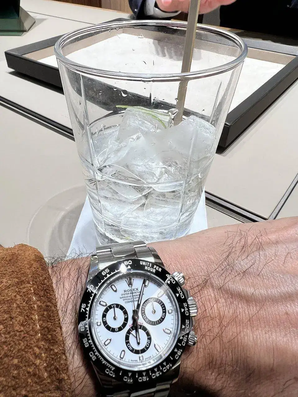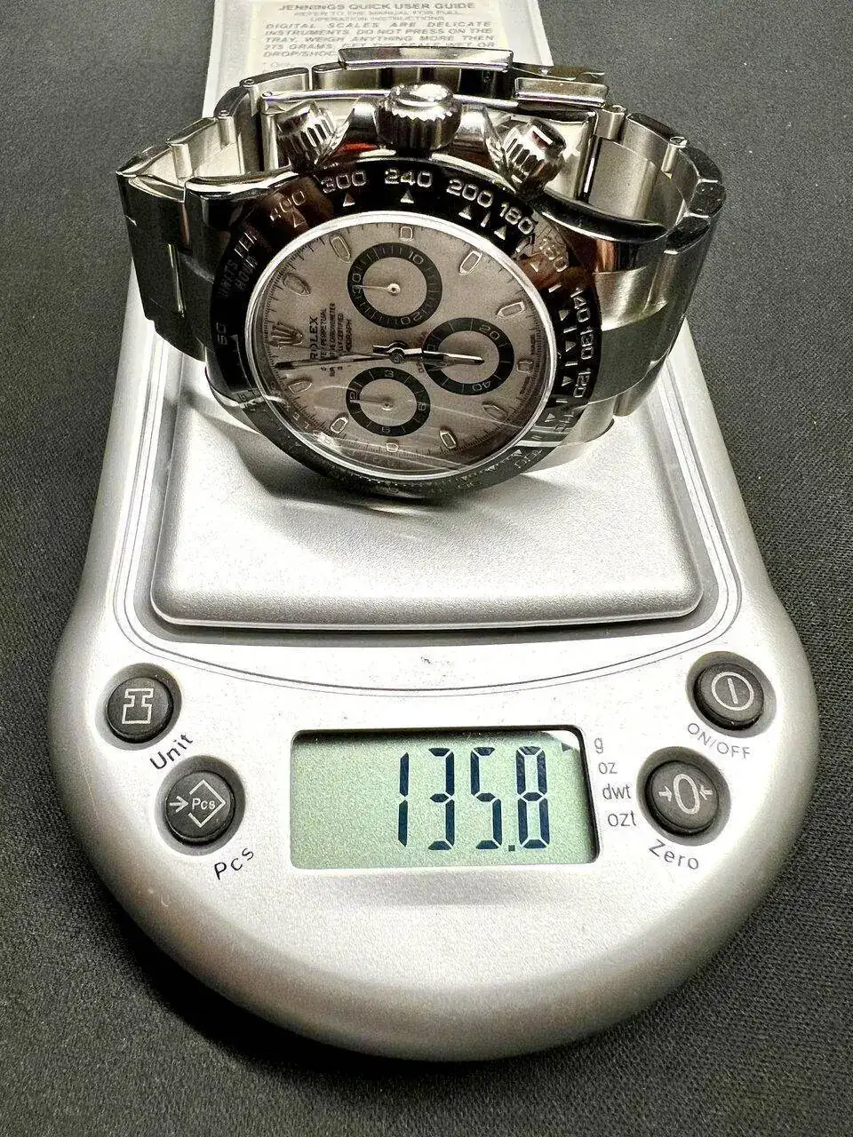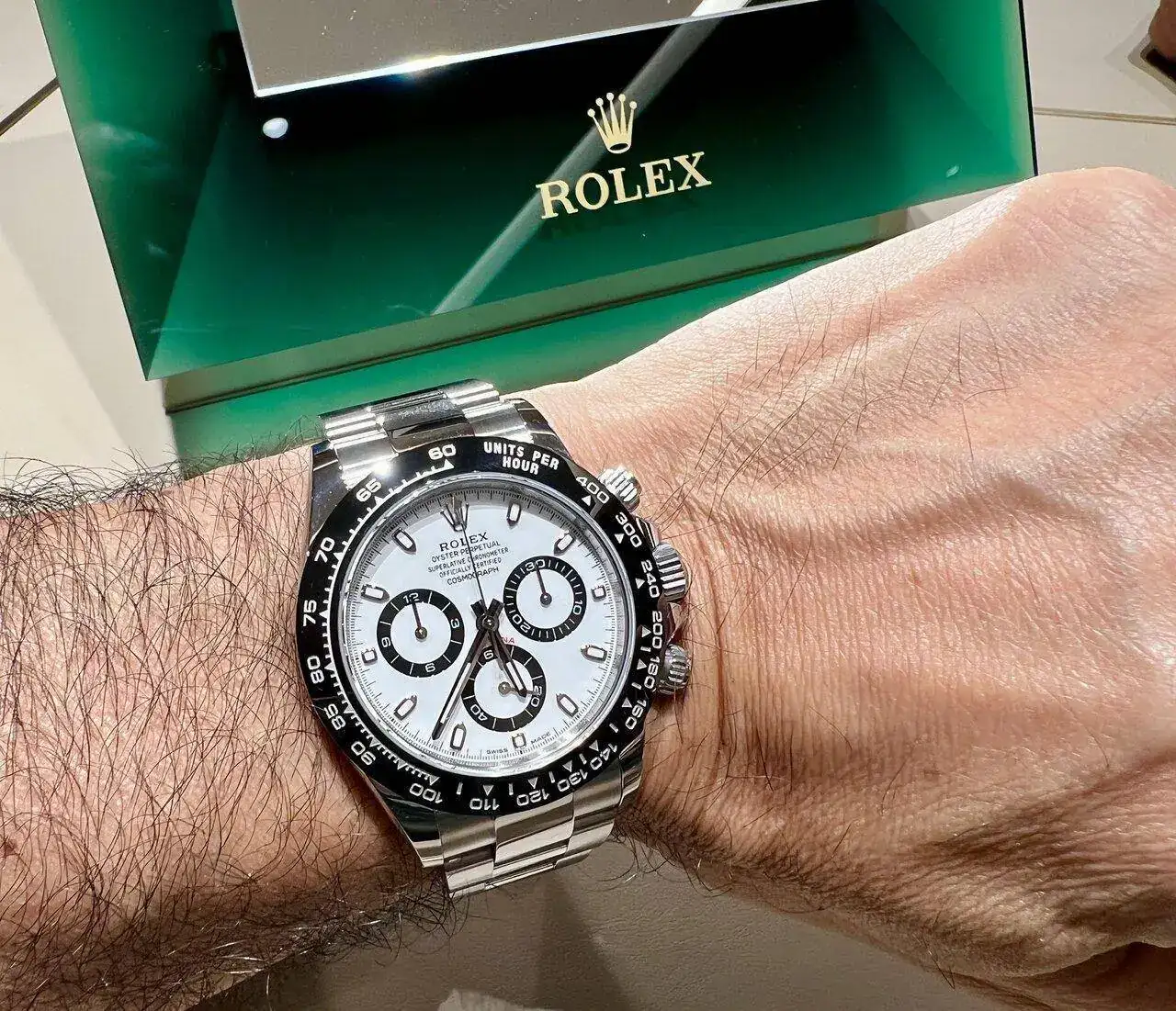 Realizada en acero 904L, como os podéis imaginar, este reloj me parece un poco pequeño. Evidentemente ya lo sabía, he llevado otros Daytona antes, pero sigo pensando que le deberían dar un par de milímetros más de diámetro (sí, ya lo sé, los puristas están ya preparando el cadalso para mi ejecución en plaza pública... 😬). Porque por mucho que se diga que es de 40mm, en realidad es de 38,5mm. Quizás da la impresión de tener un mayor tamaño por el dial blanco y por toda la botonería propia de un crono, pero la cifra es la que es:
