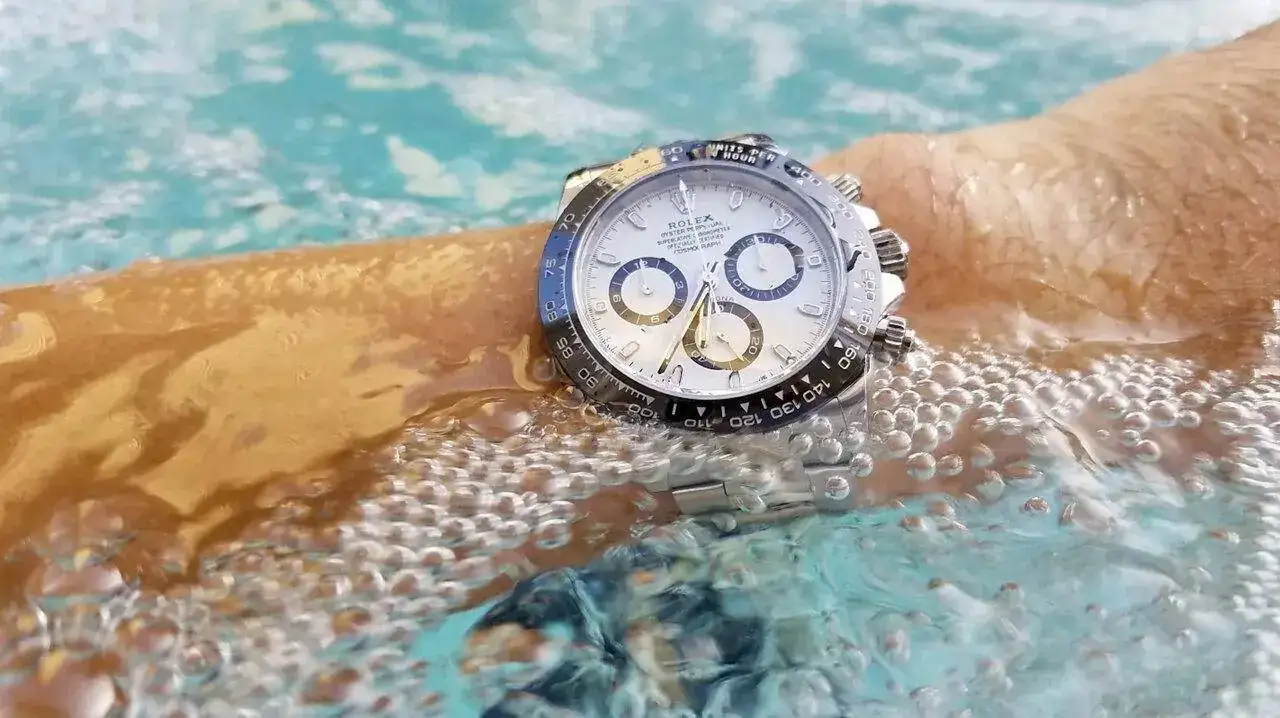 Gracias al sistema "Triplock" de la corona Rolex, el Daytona tiene una resistencia al agua de 100 metros, más que sufuciente para asegurar su uso en actividades acuáticas habituales (no hablamos de submarinismo):