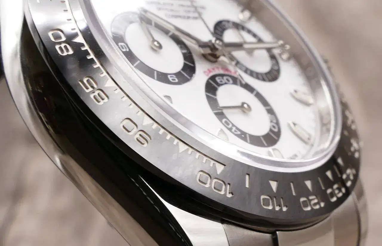 Personalmente encuentro que el cambio de material del bisel, de acero a cerámica "Cerachrom", fue uno de los grandes aciertos cuando se presentó el 116500LN en 2016. Un bisel de acero pulido a espejo es, una vez más, una fuente gustosa de huellas y rayas, y además a plena vista cada vez que miras la hora... o el reloj. Así que este bisel negro, con unas marcas en bajorrelieve que presentan una tipografía más moderna y visible, y rellenadas de platino que genera un contraste de fácil lectura, es uno de sus puntos fuertes. Le da una nueva personalidad, más racing, más integrada con el dial, al tiempo que le hace parecer más grande (menos mal... 😅).