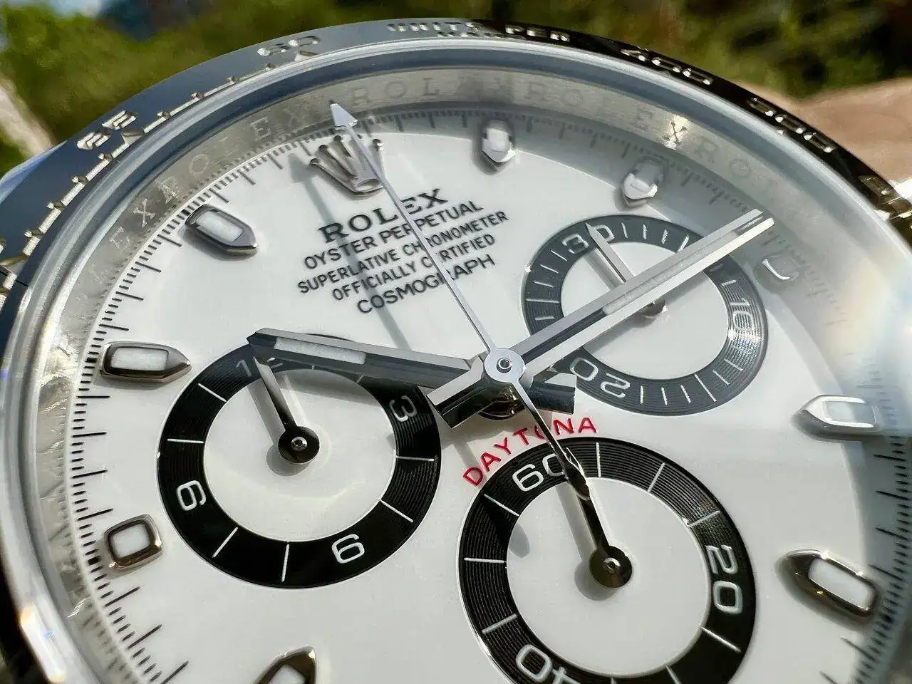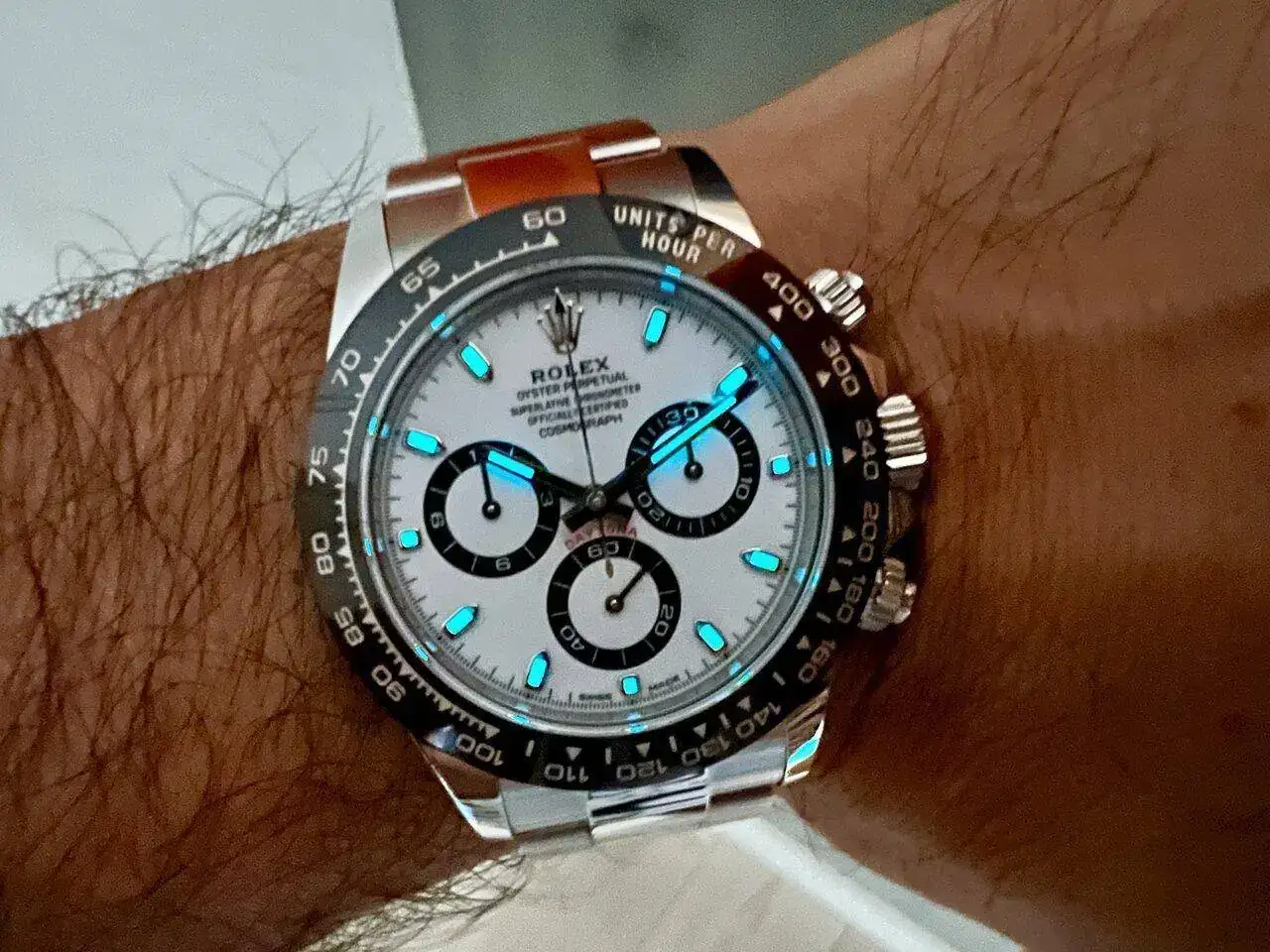 Siendo el denominado "panda", el dial es de un blanco níveo que parece cerámico. Los subdiales están delimitados por un círculo negro que combina perfectamente con el bisel, y también es un cambio que considero muy acertado respecto a la versión anterior, en la que eran plateados. Los índices son un poco rechonchos, pero no molestan, aunque los preferiría rectangulares, como en la nueva versión. Todas las agujas son finas pero sorprendentemente legibles, nada intrusivas, y el lumen es el que Rolex llama "Cromalight", que da como resultado un tono azul potente y vistoso.