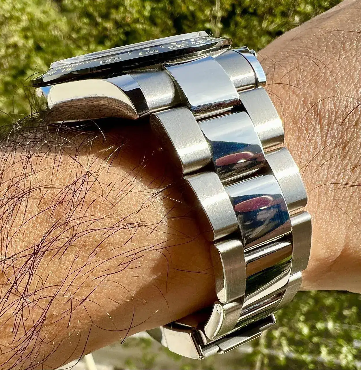 Poco se puede descubrir sobre el brazalete Oyster de Rolex: mantequilla pura, como no llevar nada. Eso sí, de nuevo están esos eslabones centrales pulidos a espejo, que preferiría cepillados. El cierre de doble bloqueo "Oysterlock" está equipado con el eslabón de extensión de 5mm llamado "Easylink", que le permite hacer un ajuste rápido para el verano, cuando la muñeca aumenta ligeramente de tamaño: