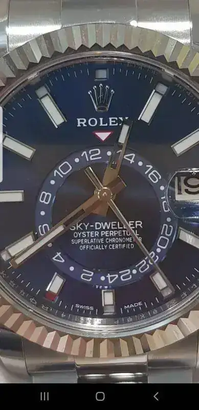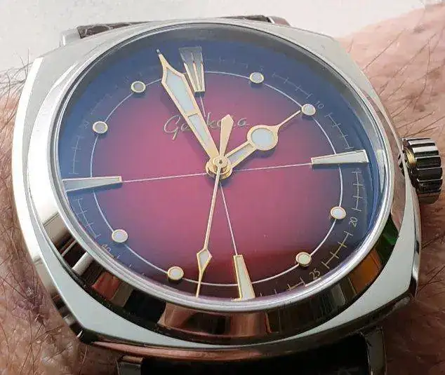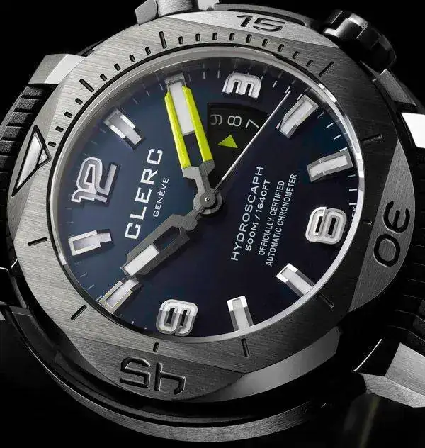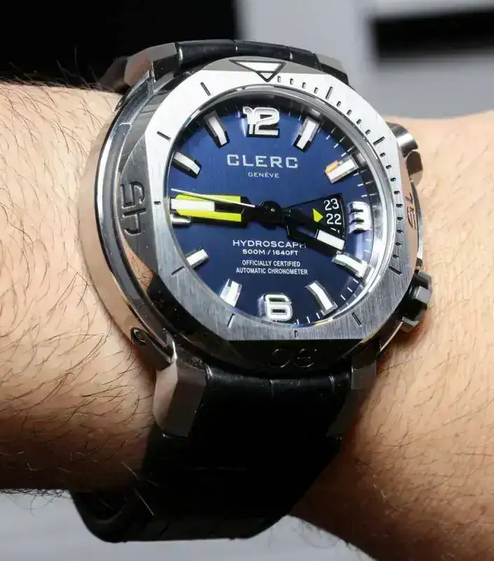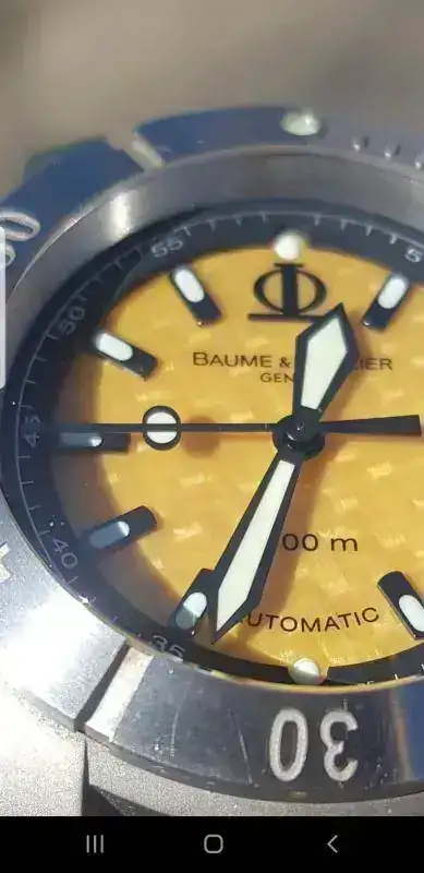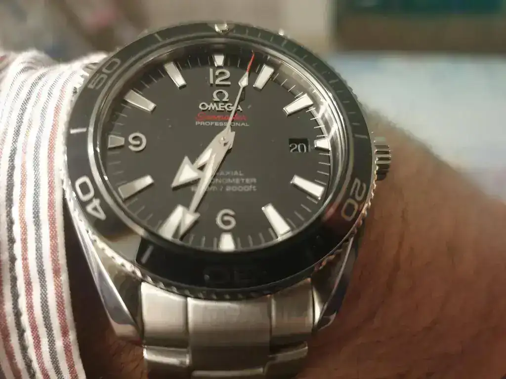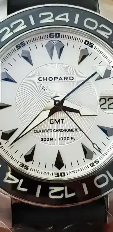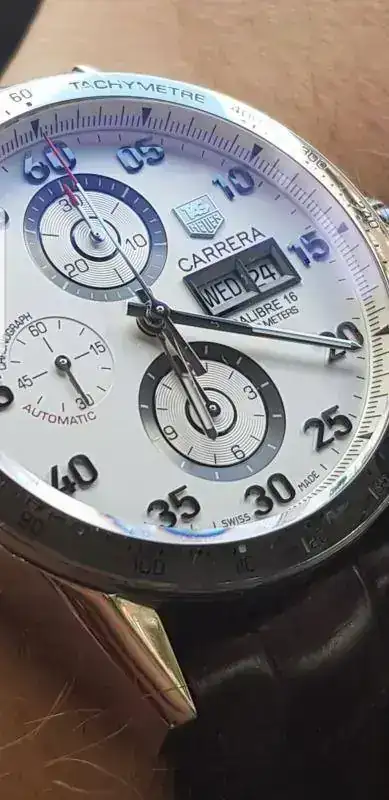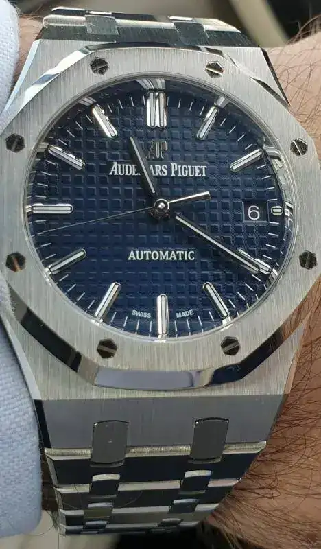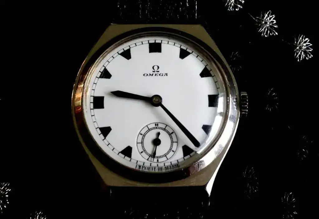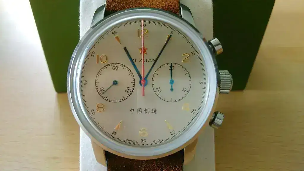 El característico escudo de la marca se observa en cada una de las puntas de ambas manecillas: