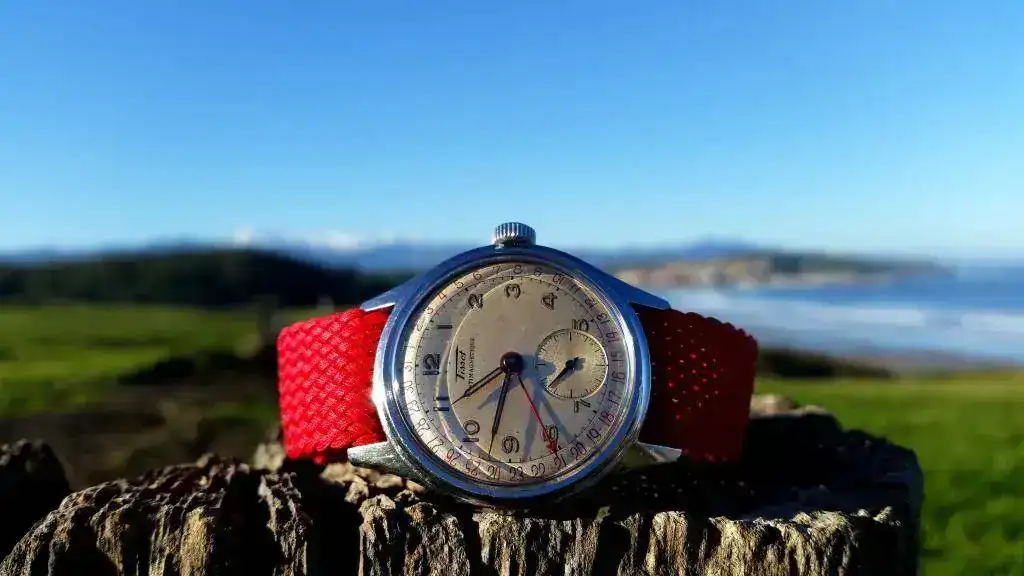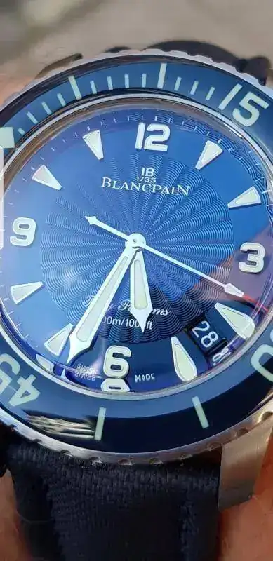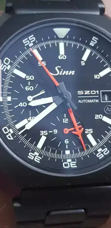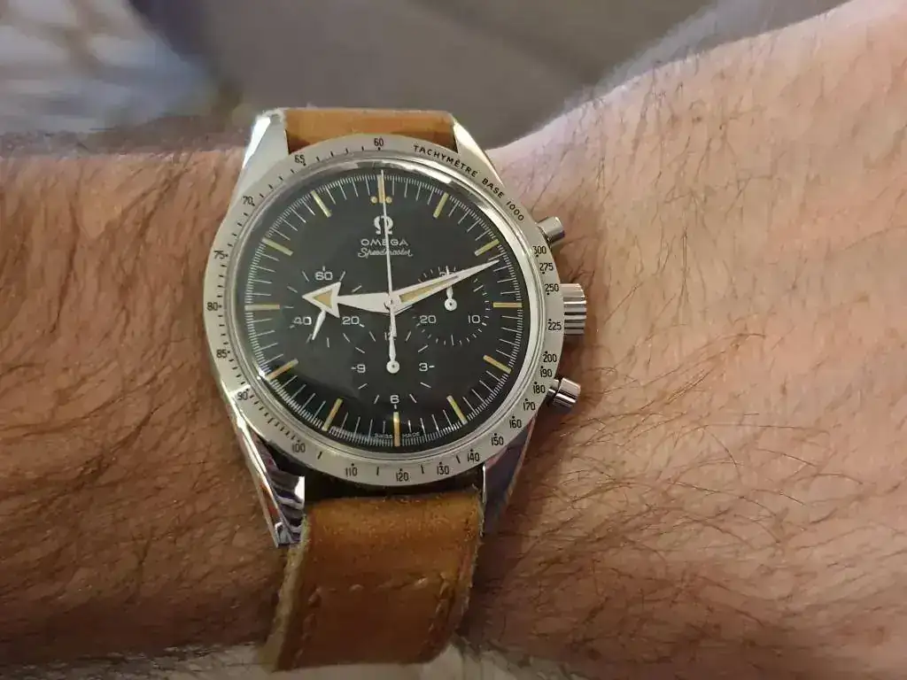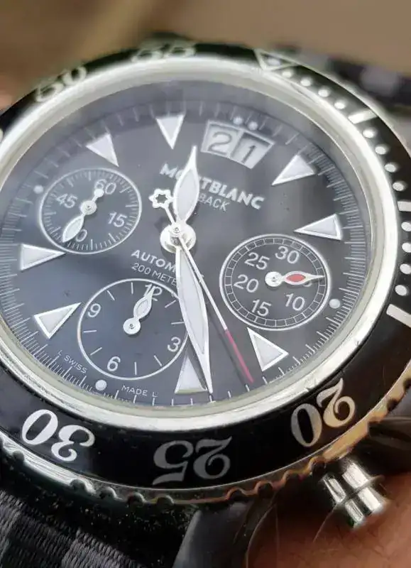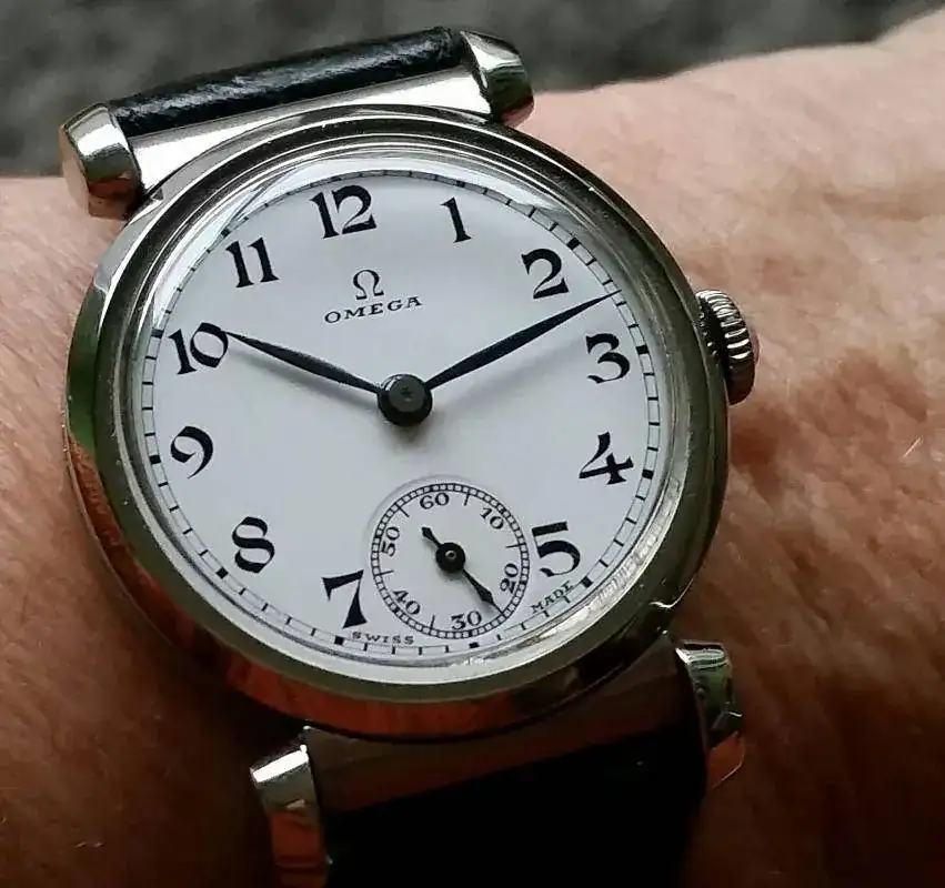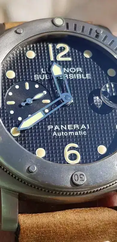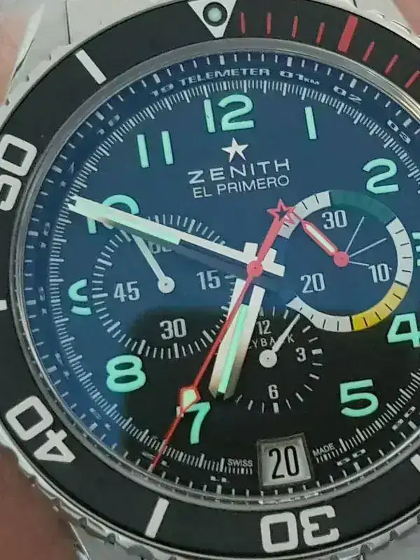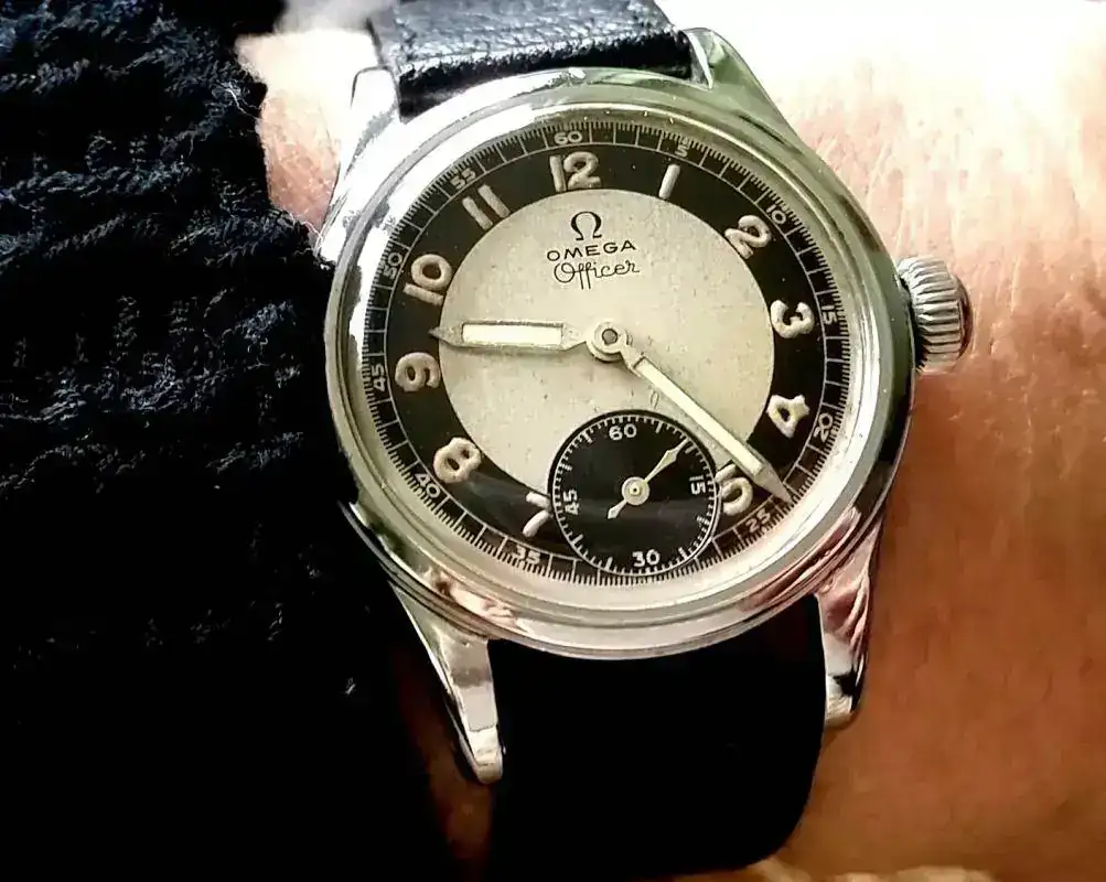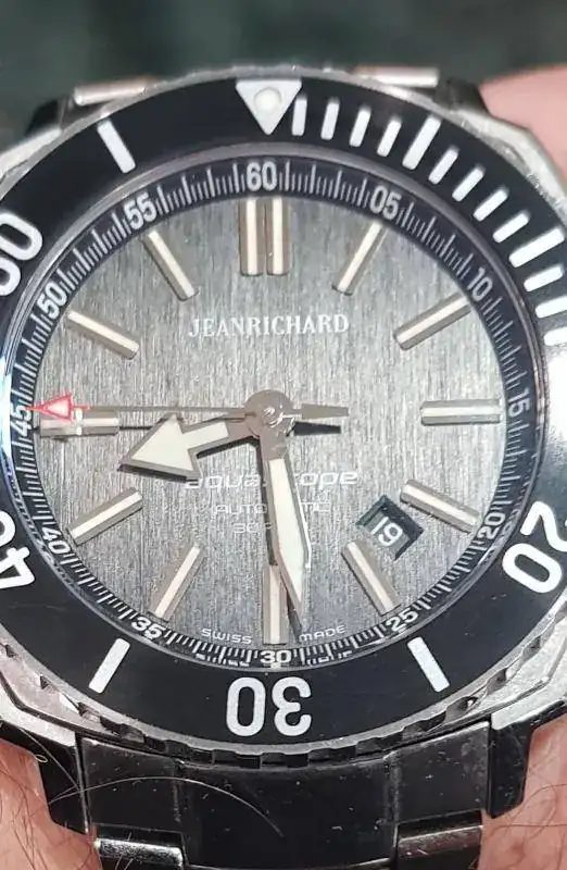 El característico escudo de la marca se observa en cada una de las puntas de ambas manecillas: