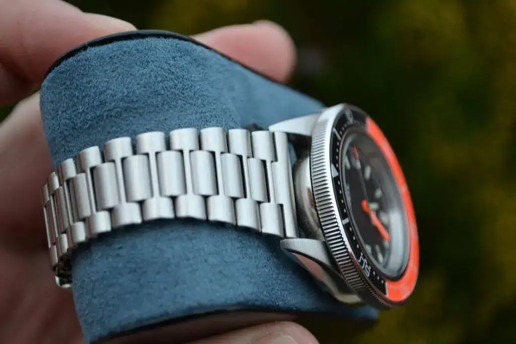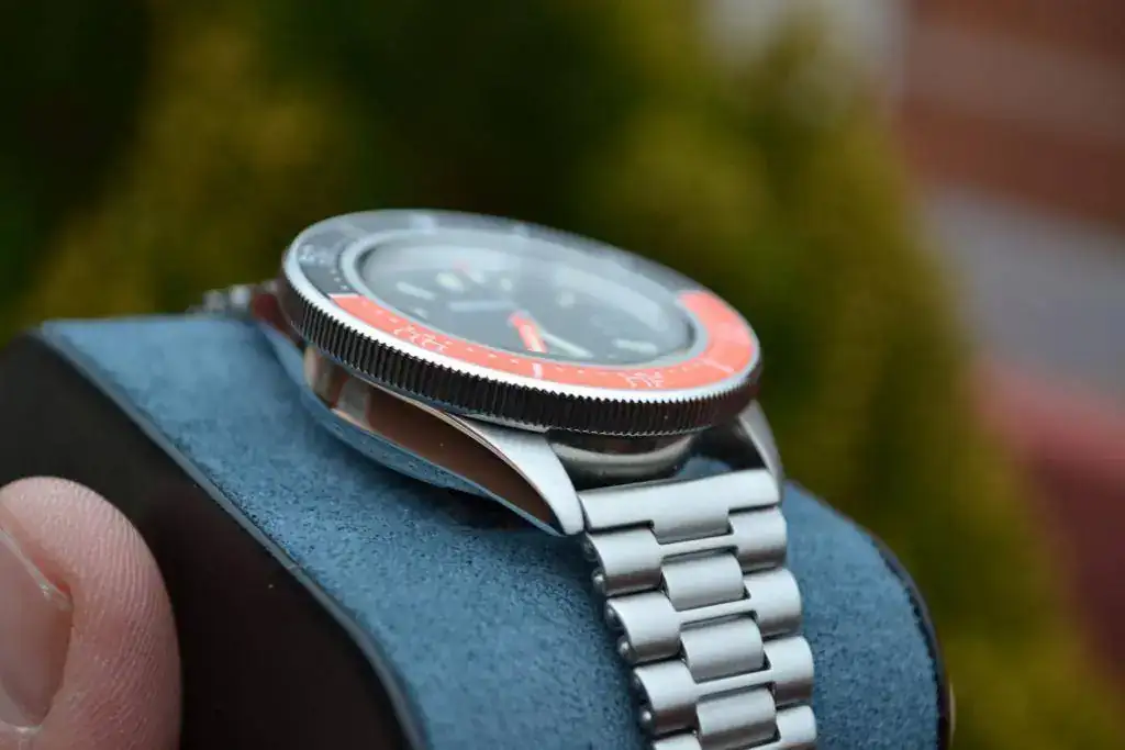 El armis es fiel al estilo setentero con eslabones pequeños y doblados que reducen su medida al llegar al cierre desplegable. Tiene un bonito bisel movil negro y naranja.