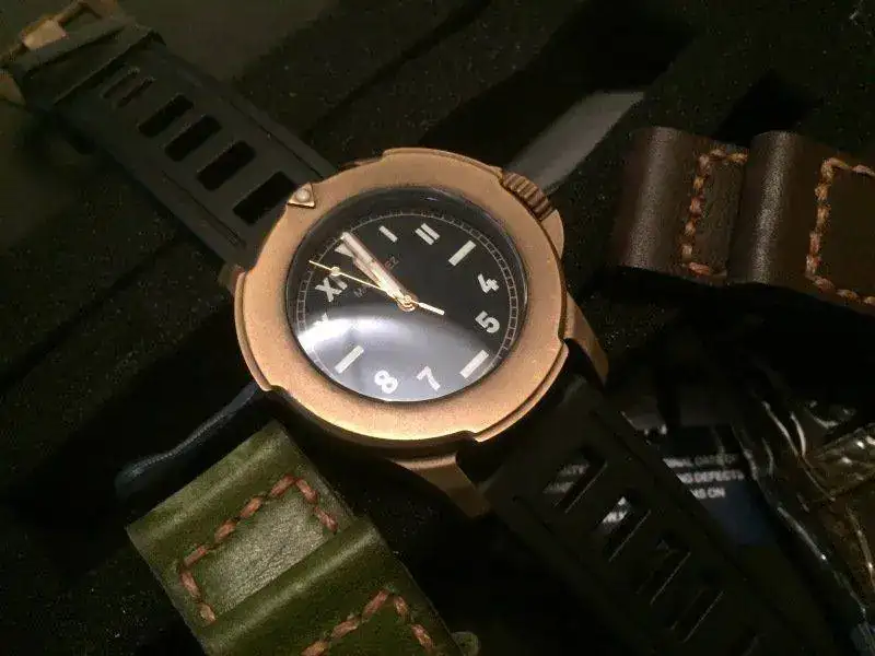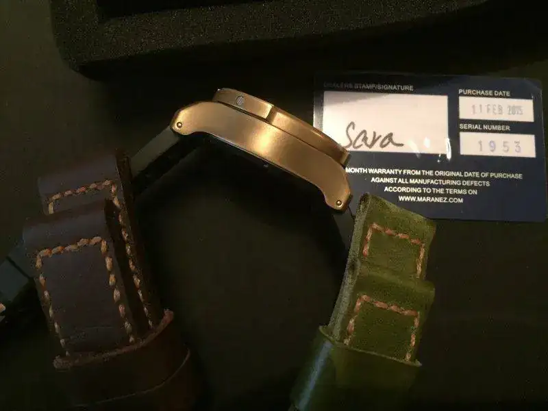 Buenos días chicos/as, pues lo dicho en el título, vendo mi precioso Maranez Bangla 44mm, esta vez se trata de un mastodonte con caja de bronce, 44mm de diametro por 18 mm de alto, movimiento automatico seiko NH35 y una estética alucinante. Como podéis ver en las fotos todavía le queda mucha garantía por delante, el relój se envía con toda la documentación original, todos los embalajes, correa de caucho original con su cierre, correa original de Maranez con otro cierre de bronce original y dos correas artesanas que le quedan de muerte. A continuación las fotos: