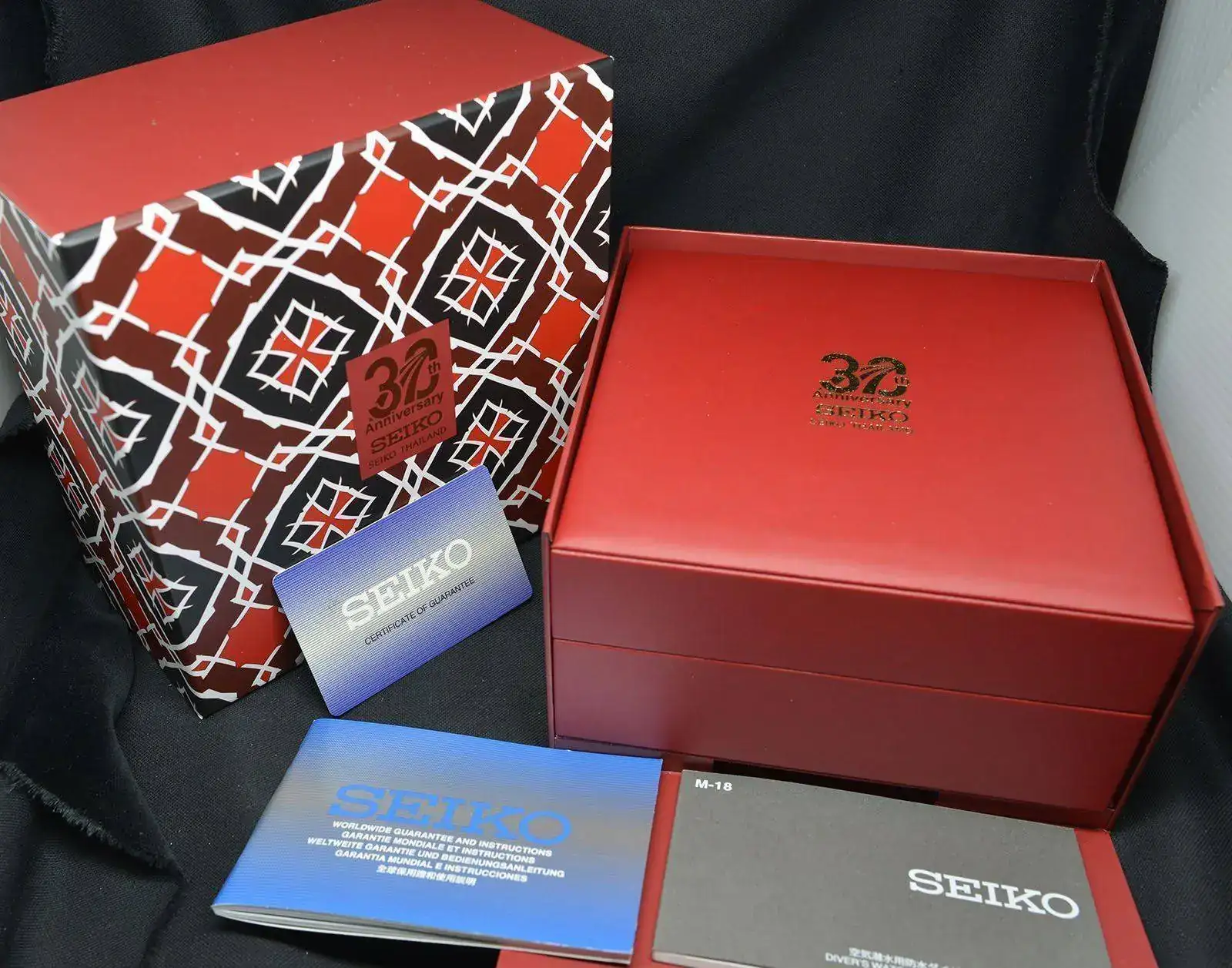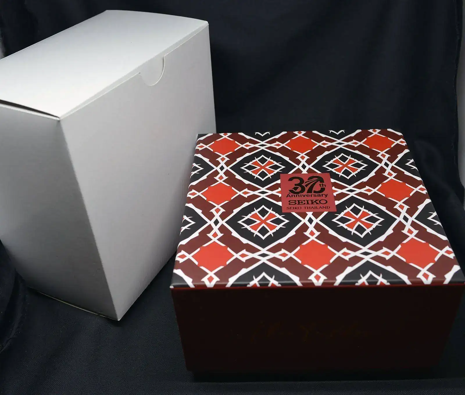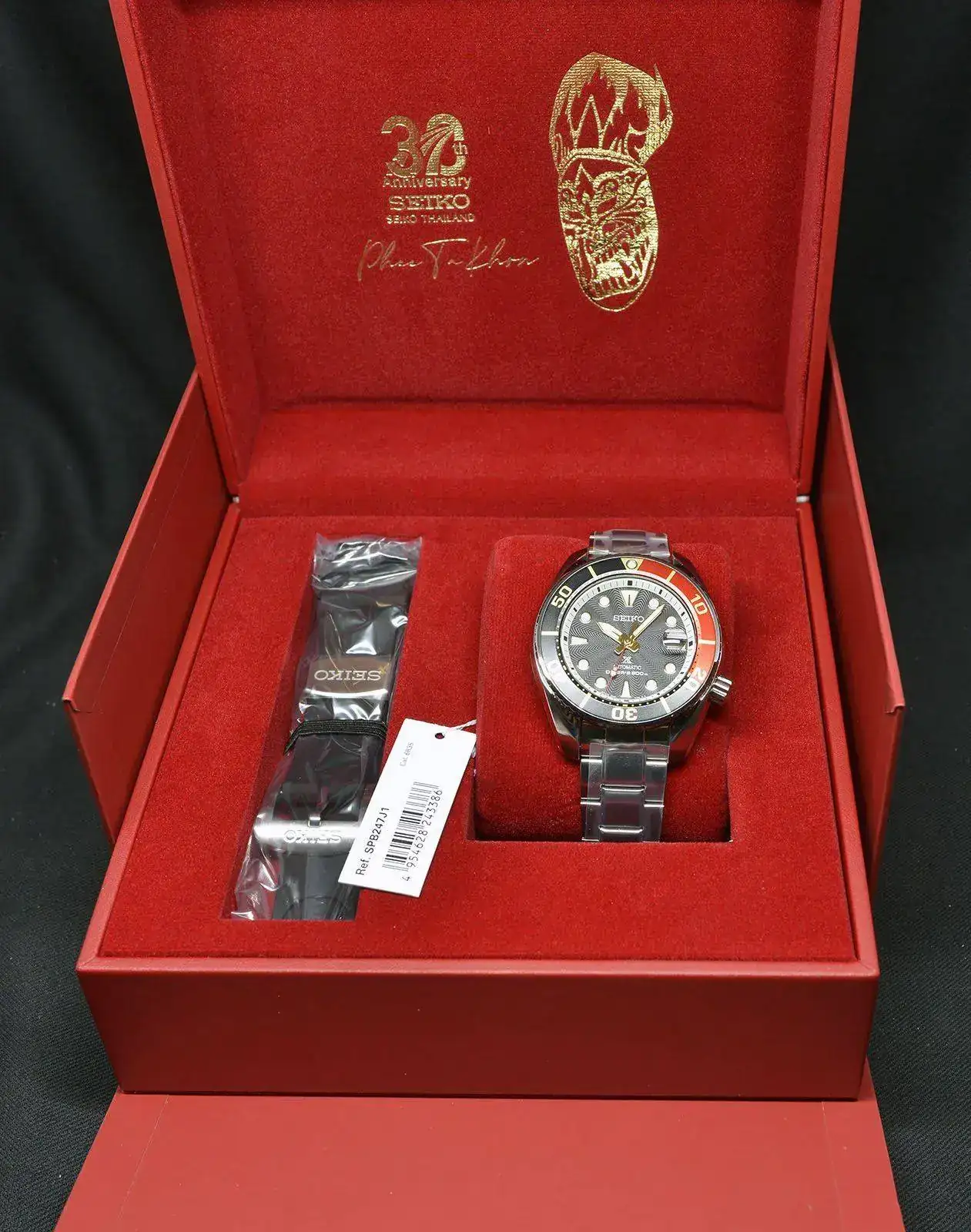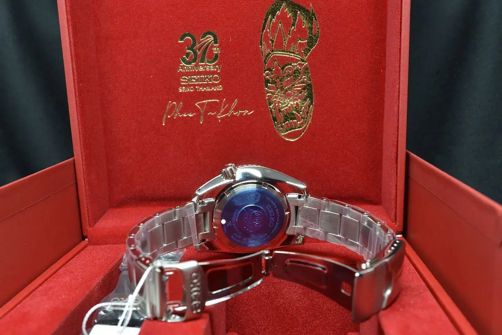 Viene con una maravillosa caja de cartón rígido, decorada con los colores del Festival, y con otra dentro de polipiel con terciopelo rojo oscuro que es una delicia. El logotipo está estampado con el logotipo del 30 aniversario de Seiko Tailandia y el símbolo "Golden Phi Ta Khon Mask" con una correa de caucho