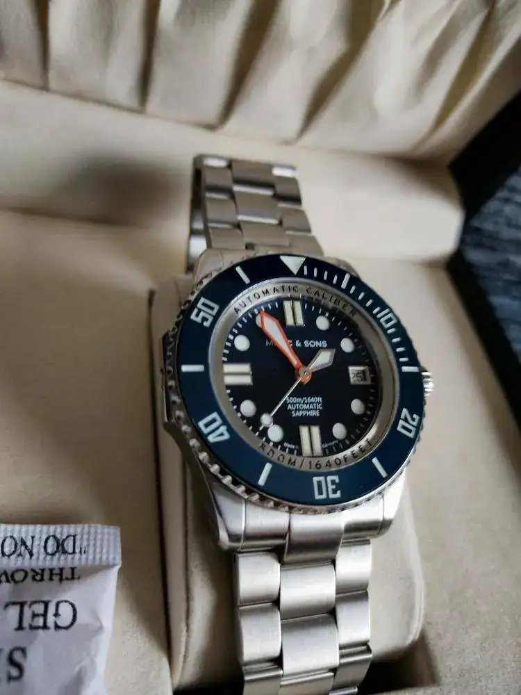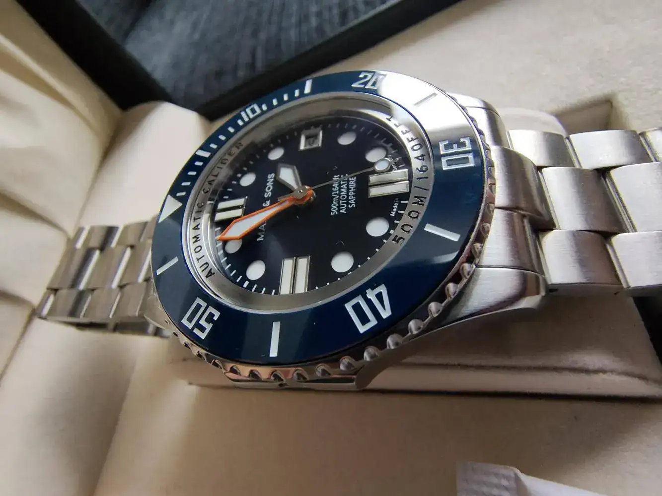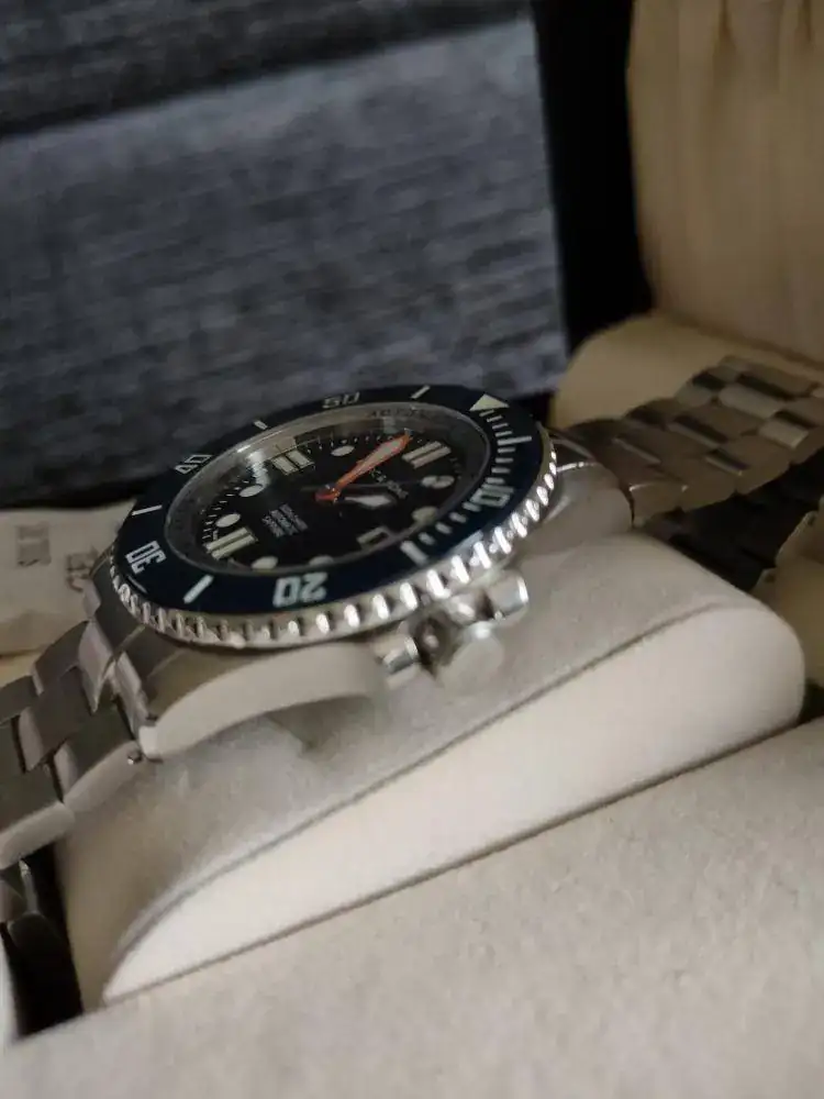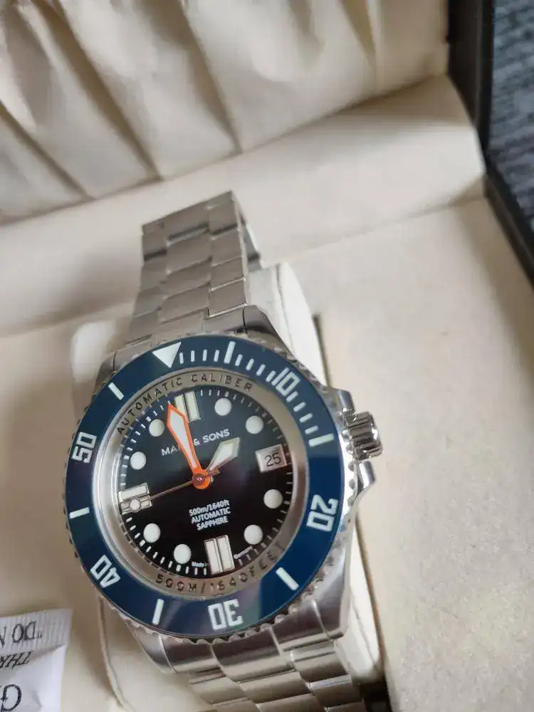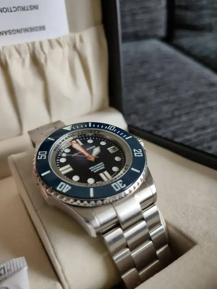 Disponible para la venta este magnífico reloj Alemán. Dial y esfera azul. Hecho con mucho cariño y detalles. Empezando por llevar el conocidísimo calibre ETA 2824. Cristal Zafiro, bisel cerámico, válvula de Helio... Profundidad de 500m, luminova azul, aguja minutera en naranja... Cuántos alta gama hubieran pinchado ya en la comparativa de alguna de estas características...