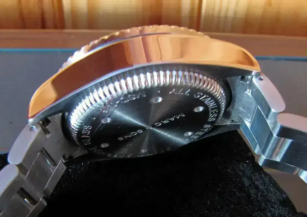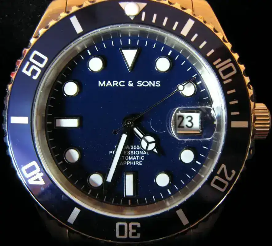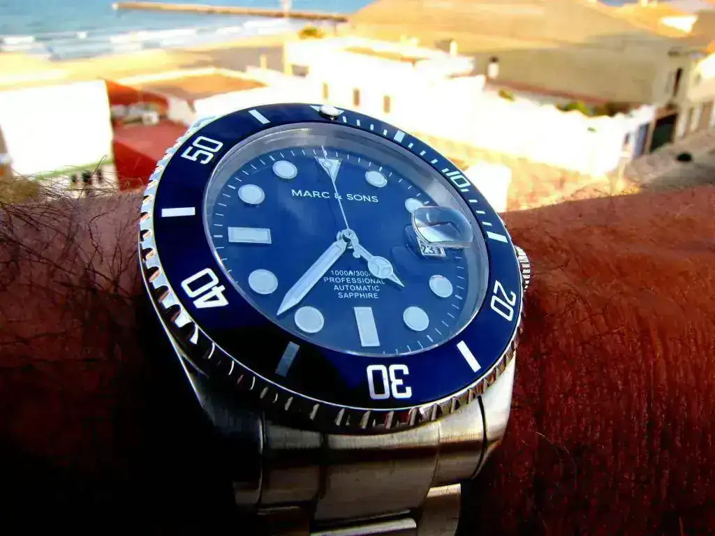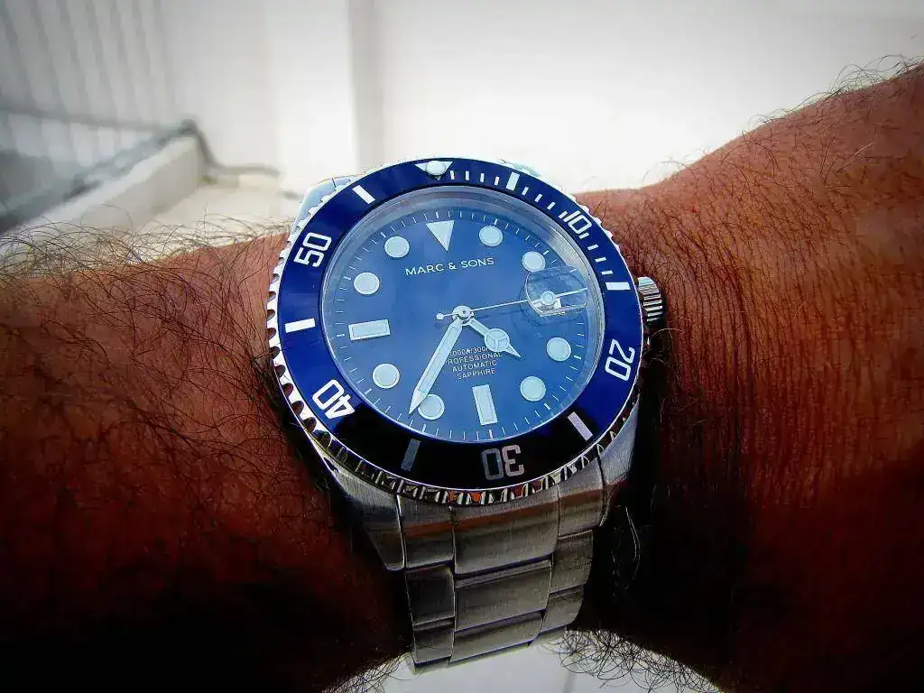 Es un 42mm. que imita perfectamente el Submariner, con la ventaja de ser un poco más grande. Tiene una gran calidad. Lleva el armis de acero cepillado, cristal zafiro y la lupa correspondiente. Sumergible a 300m.