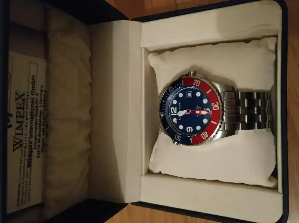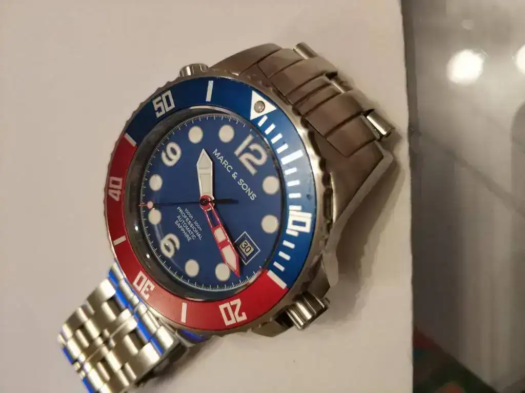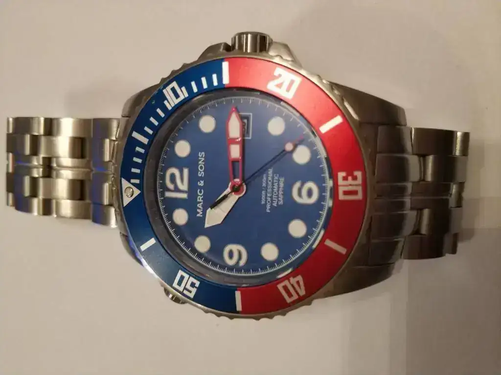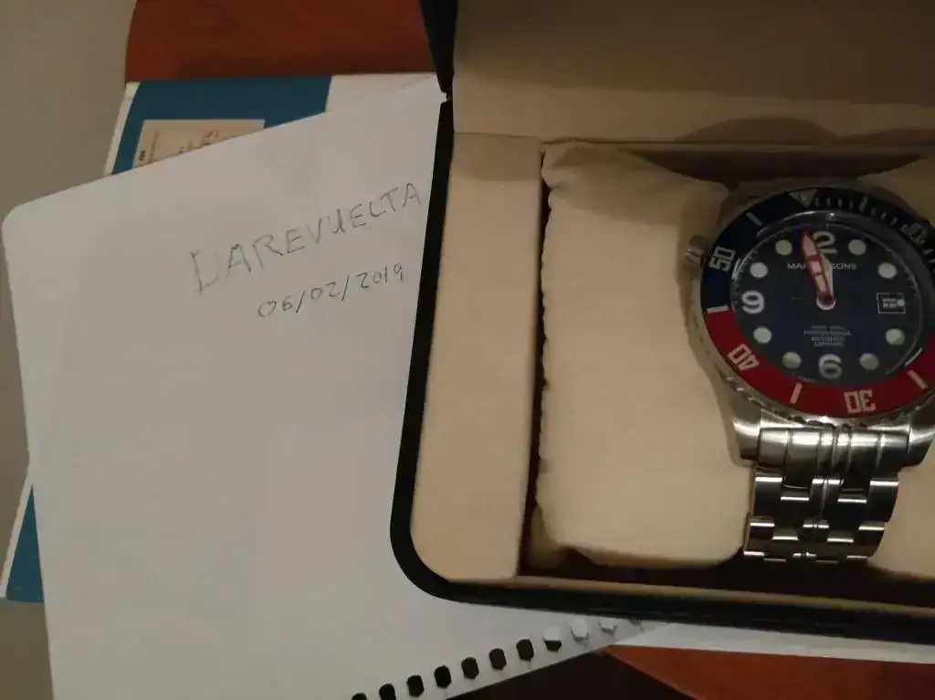 Tras mucho meditar, saco a la venta mi Marc & Sons Pepsi Auto que compré hace año y medio a un mercante del foro. El reloj está usado pero muy bien cuidado y se vende con su estuche original en estado impecable.