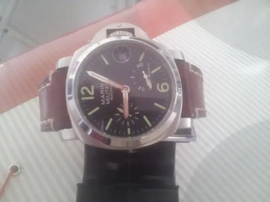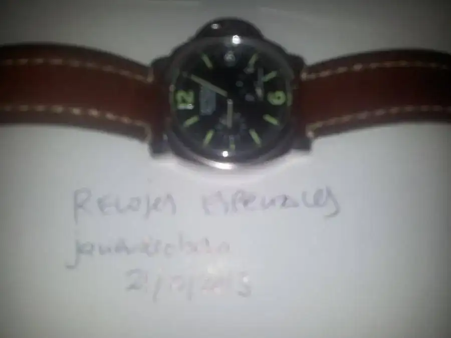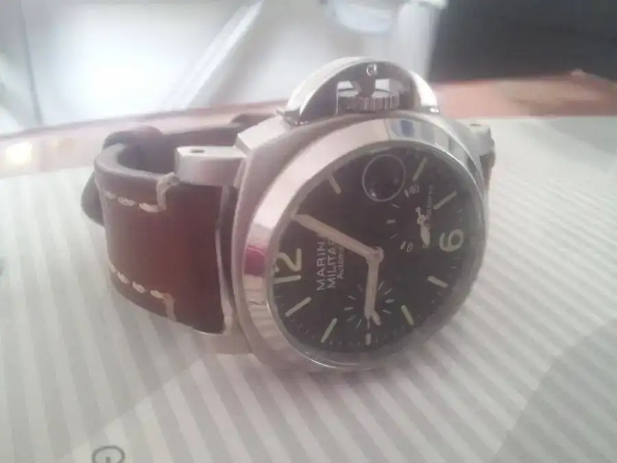 Marina Militare de 40mm, power reserve, de marcha va muy bien, en muy buen estado, solo reseñar un leve arañazo y rascada que sale del botón situado a la izquierda, el que sirve para cambiar la fecha, a la lado de la garra derecha arriba, también tiene 2 picadas, 1 microarañazo en cristal, hay que buscarlo con ganas y a contraluz, pero esta. Estos desperfectos apenas se ven pero lo menciono para evitar problemas. Prefiero ser exagerado, no como mi anterior compra que el forero vendía el reloj con grandes defectos y se los callaba ¡hay mucho listo en esta vida!, menos mal que la mayoría es gente seria.