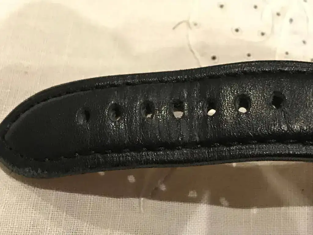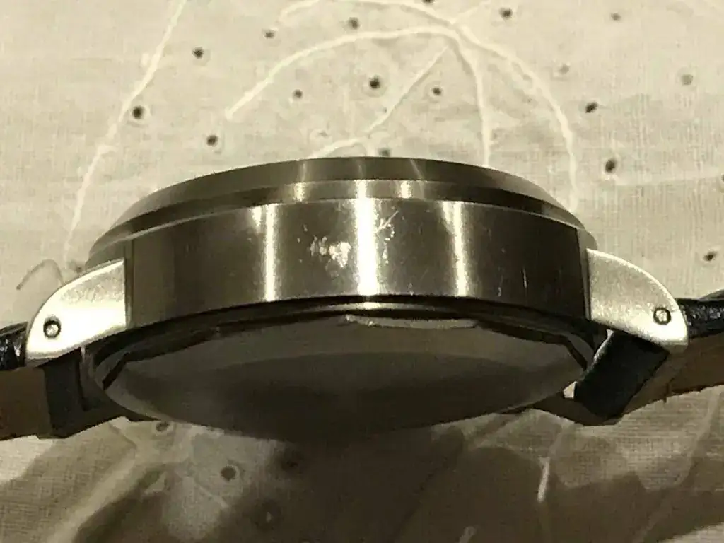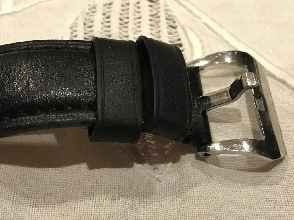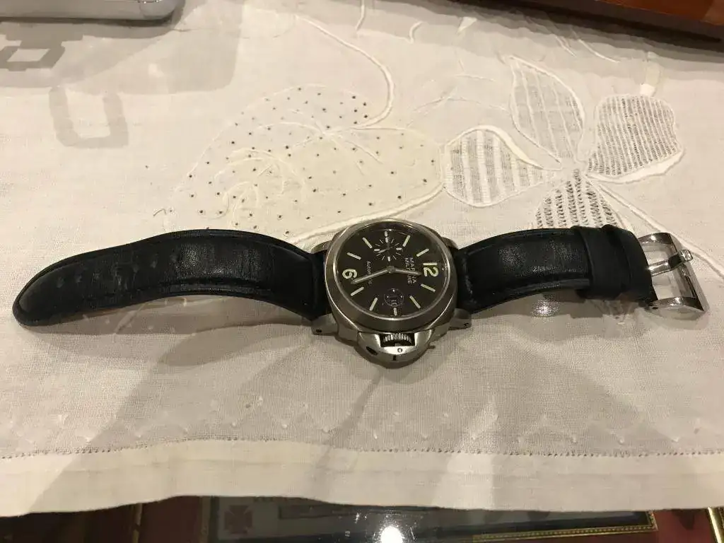 De 44 mm con correa negra en polipiel, en buen estado, con algun pelillo y alguna marquilla que pongo en alguna foto.