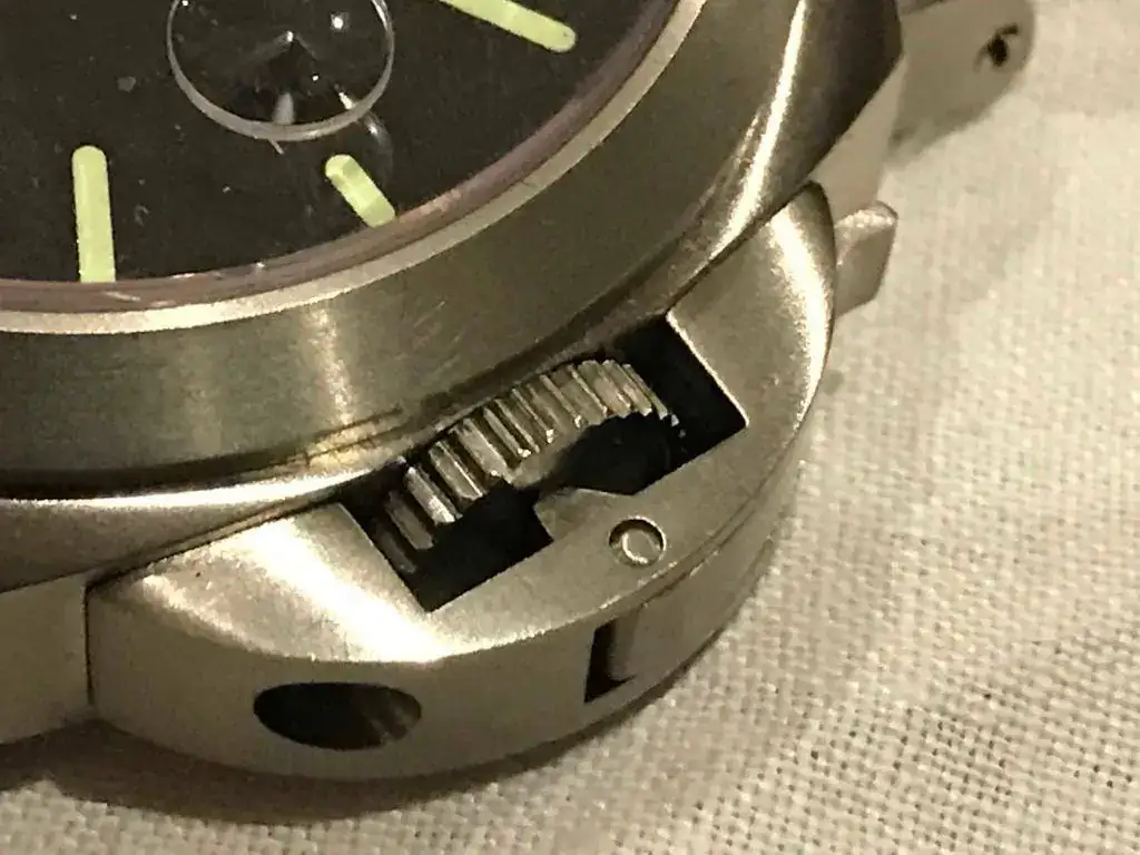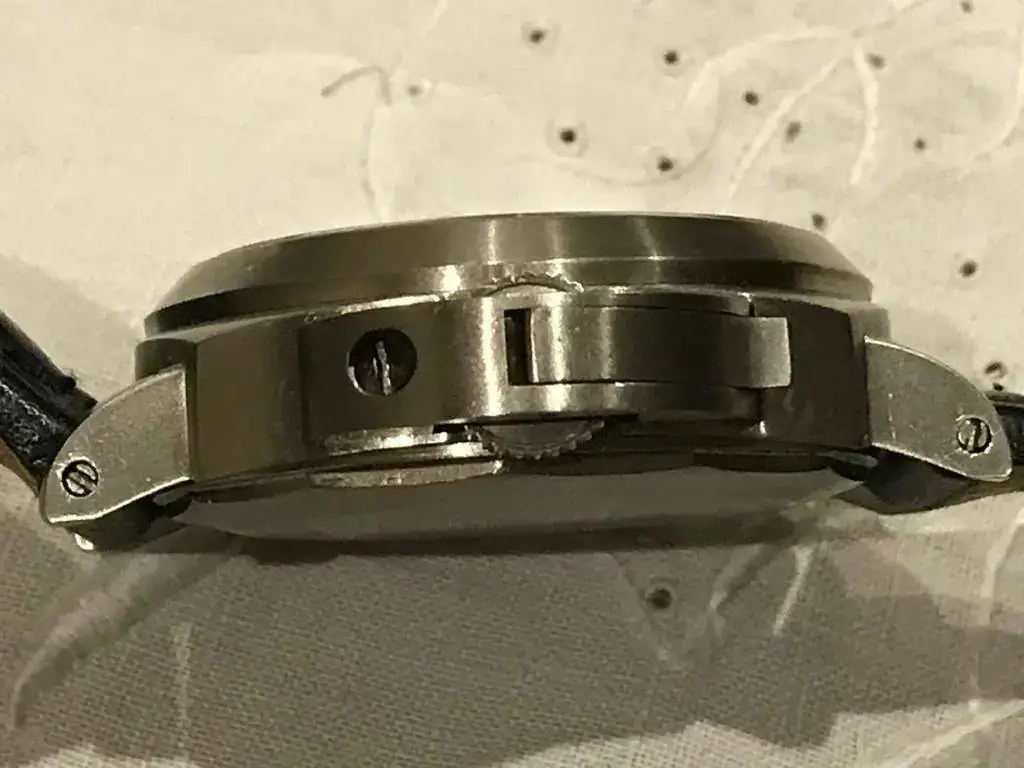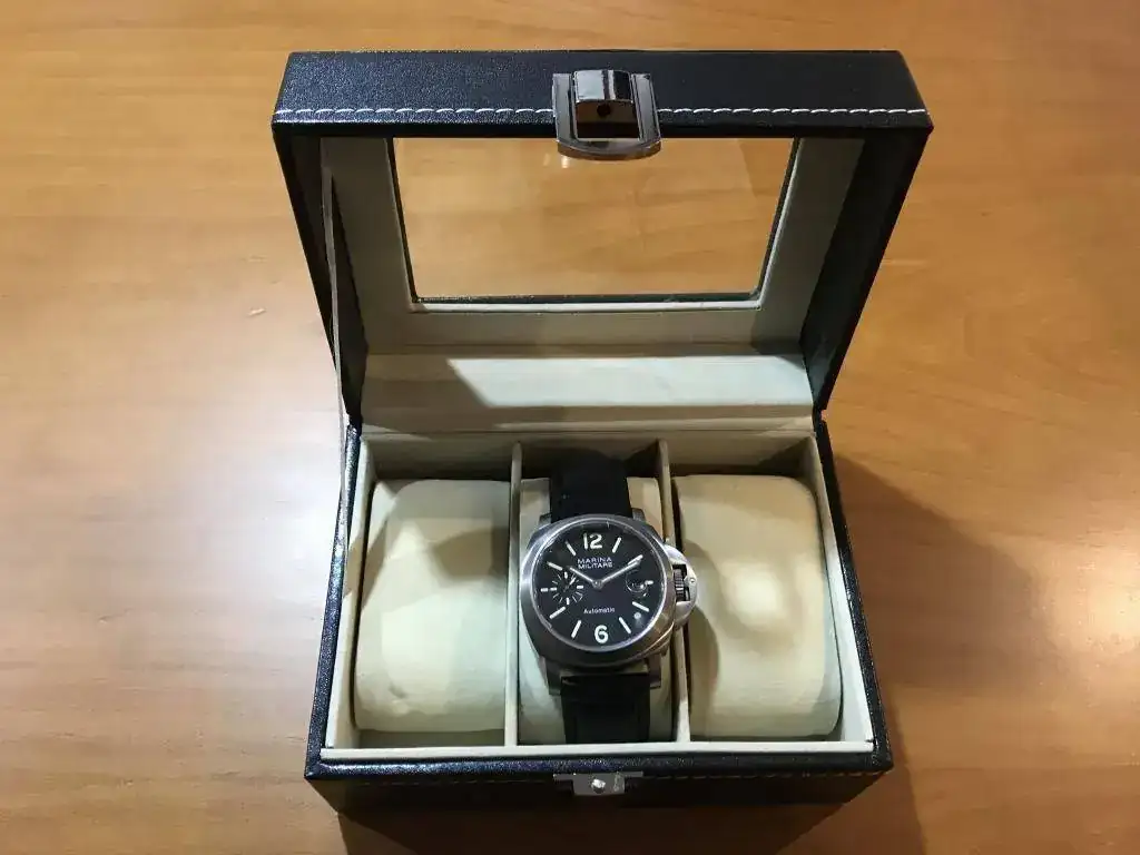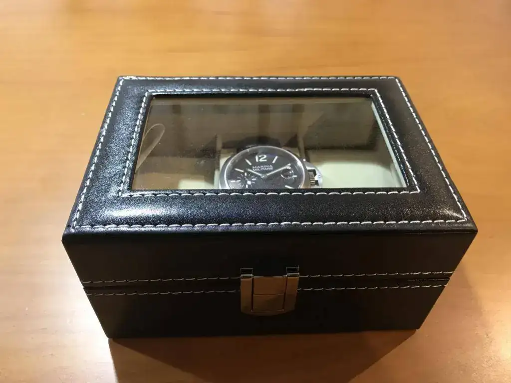De 44 mm con correa negra en polipiel, en buen estado, con algun pelillo y alguna marquilla que pongo en alguna foto.