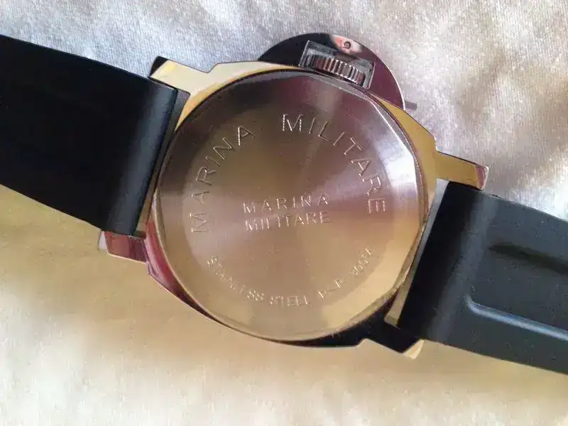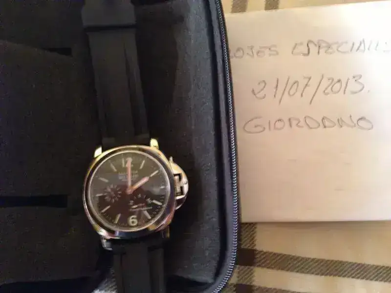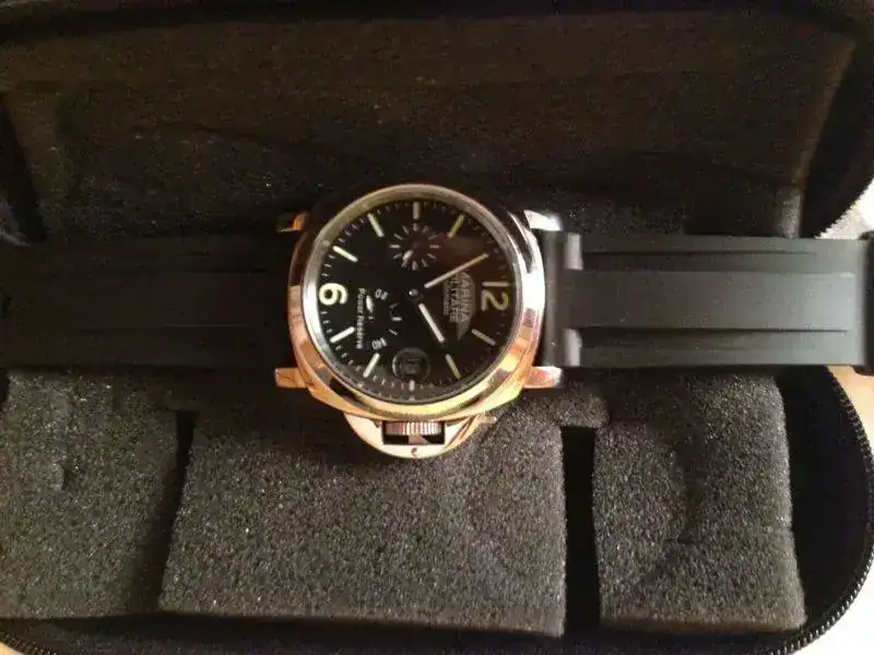 esfera negra con indices luminiscentes , minutos a las nueve , resrva de marcha