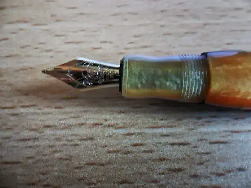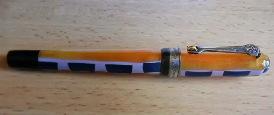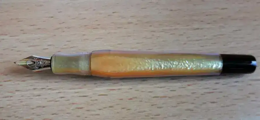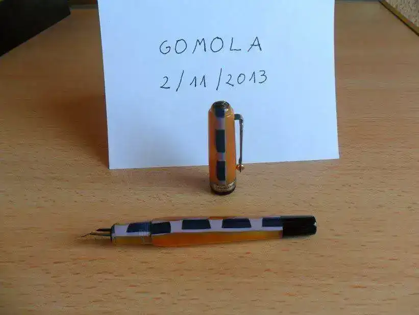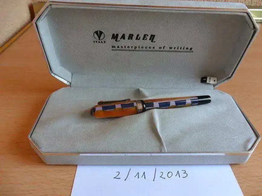 En el cuerpo observamos el culote, que es preciso desenroscar y retirar para acceder al sistema de carga, elaborado en resina de color negro; realizados en la combinación de colores y diseño ya reseñada en el capuchón, se nos presenta el fuste y la boquilla; esta última porta un plumín de oro de 18K., bicolor debido a la aplicación de rodio en la parte central, y que además del grabado del logo incluye “MARLEN”, “ITALY” y “18K”; en este ejemplar es un tipo F el sistema de carga es mediante el uso de un convertidor de émbolo, accesible desde el culote.