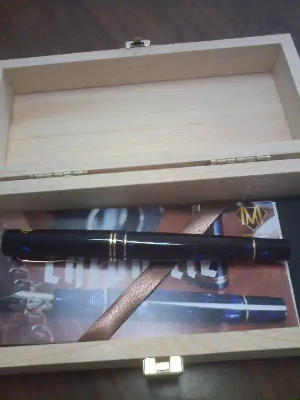 Es como la de Quichi pero azul oscuro y negra, a la luz es muy bonita, luego a mediodía le pondré tinta Herbin Poussière de Lune a ver como va. No sé si será muy espesa, estoy dudando si ponerle esa o la Montblanc Lavender Purple.Unas fotos.