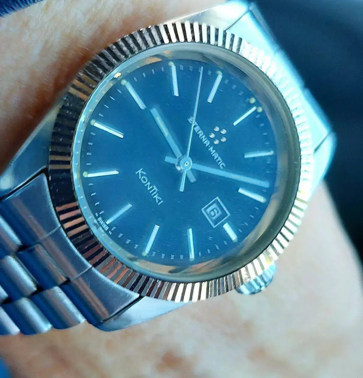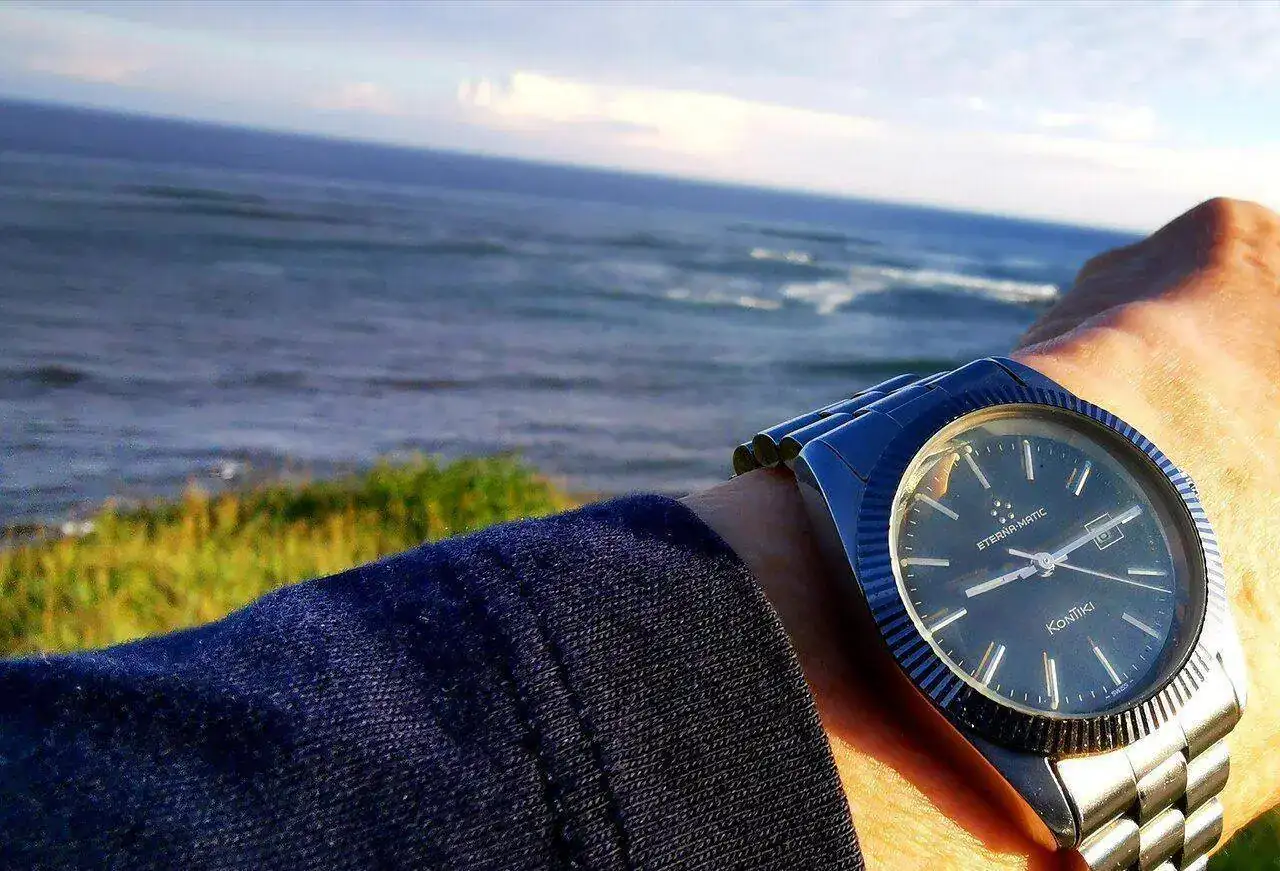 Muy bonito el Eterna Matic Kontiki y ese mar al fondo con el verdor pegado a él...