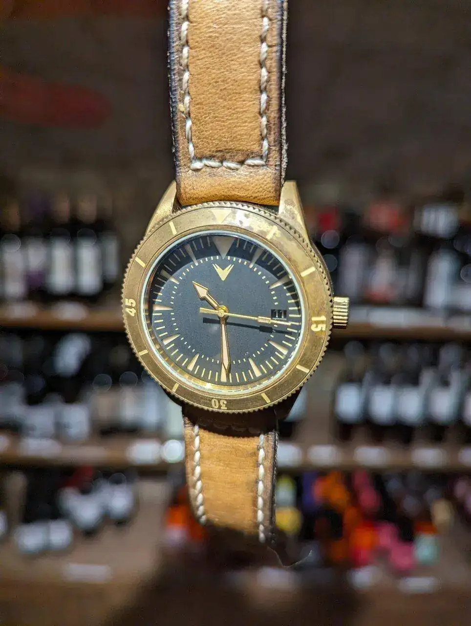 Pues ni tan mal...Hoy toca un invento (y sacrilegio), mi ventus Mori brass (diver 300m) con una correa de cuero. Lo tenía abandonado esperando su patina.