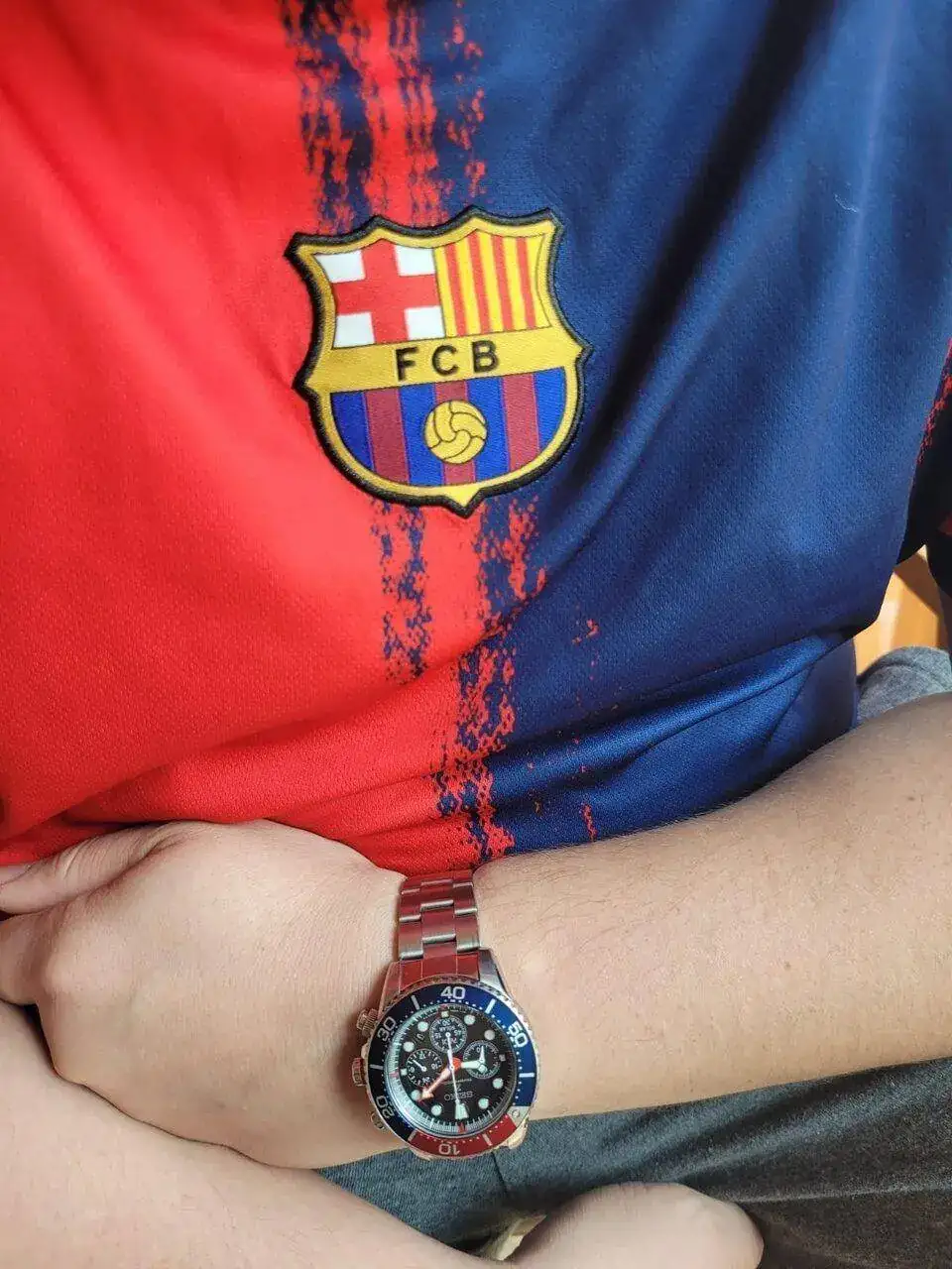 Blaugrana la camiseta y blaugrana el biselHoy con ayuda de mi esposa fotito mientras esperamos el café.