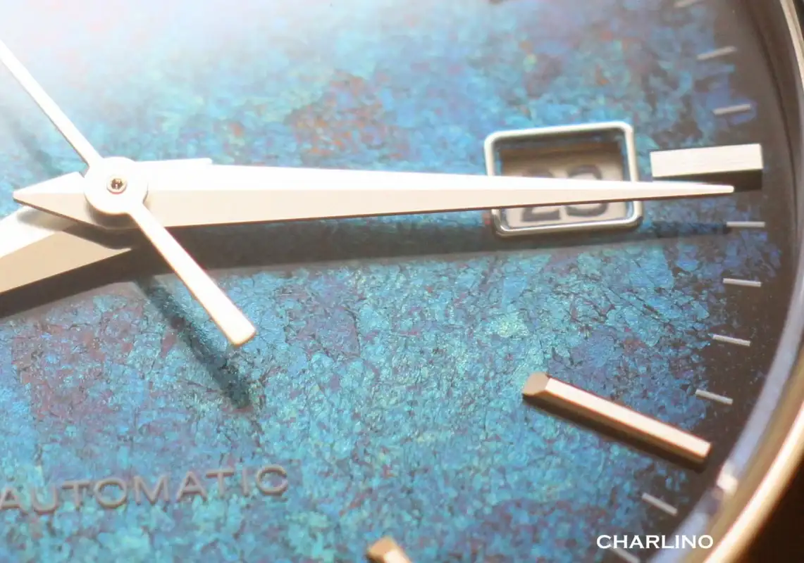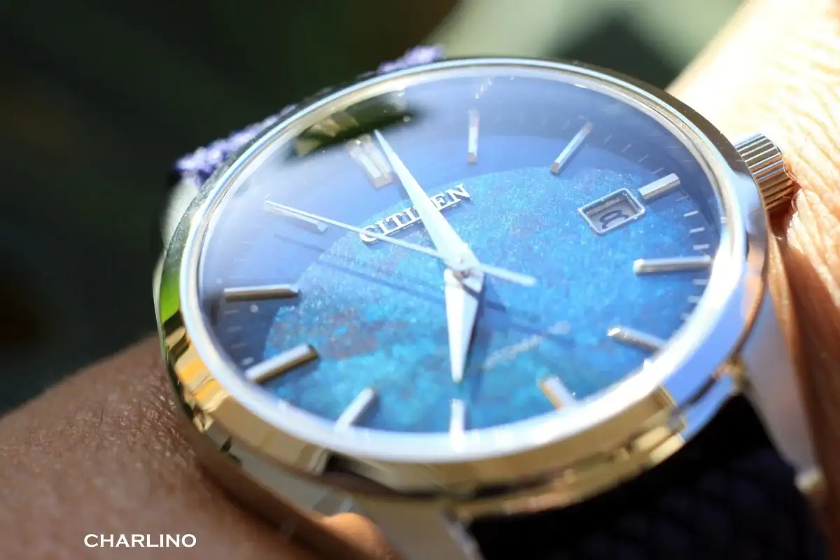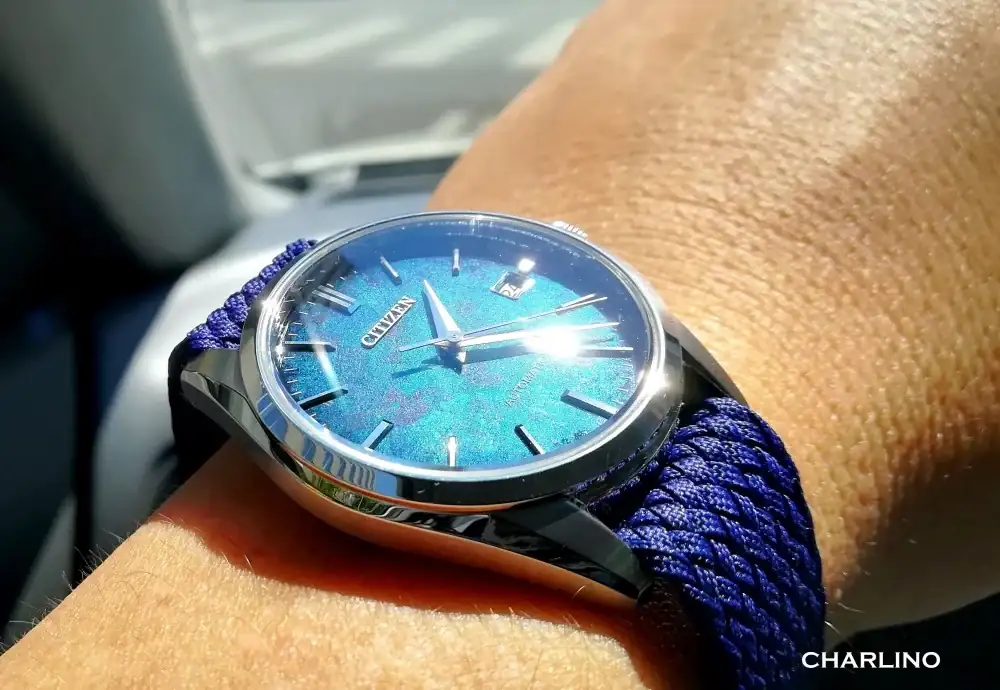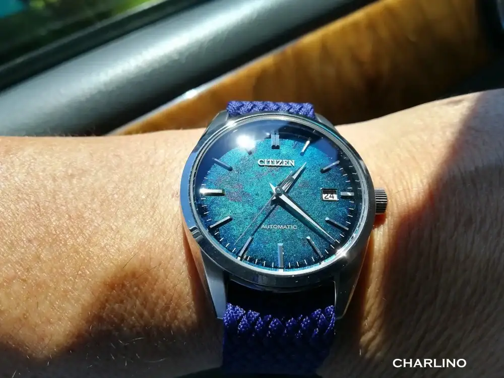 Muchas gracias compañero, es el Citizen NB1060-12L Silver Leaf Lacquer. Un reloj con una esfera muy especial que es lo que suele llamar más la atención, pero el resto no se queda atrás. La esfera está hecha mediante un proceso con pan de plata, pintado y lacado, que hace que cada ejemplar sea único además de muy bonito. A primera vista es una bonita esfera degradada de tonos azules, unos más claros, otros más oscuros, a veces verdosos según la luz que le de, y con un estilo de apliques horarios y agujas dauphine típicos del clásico reloj japonés de vestir. Pero viéndolo al natural, cuando le da bien la luz, esta es la esfera que más magia me transmite de cuantas he visto, es única, con tal cantidad de matices y tal originalidad, que es el reloj que más veces me quedo contemplando por puro disfrute y no por ver la hora. En fotos se puede ver bonito, pero al natural es otra historia.