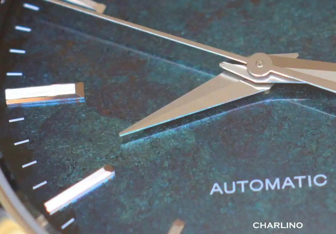 No solo los colores son interesantes. Las agujas tienen dos caras, una está pulida a espejo y la otra satinada. Los apliques son finos y altos, facetados y muy bien acabados. Es un reloj muy elaborado y bien hecho.