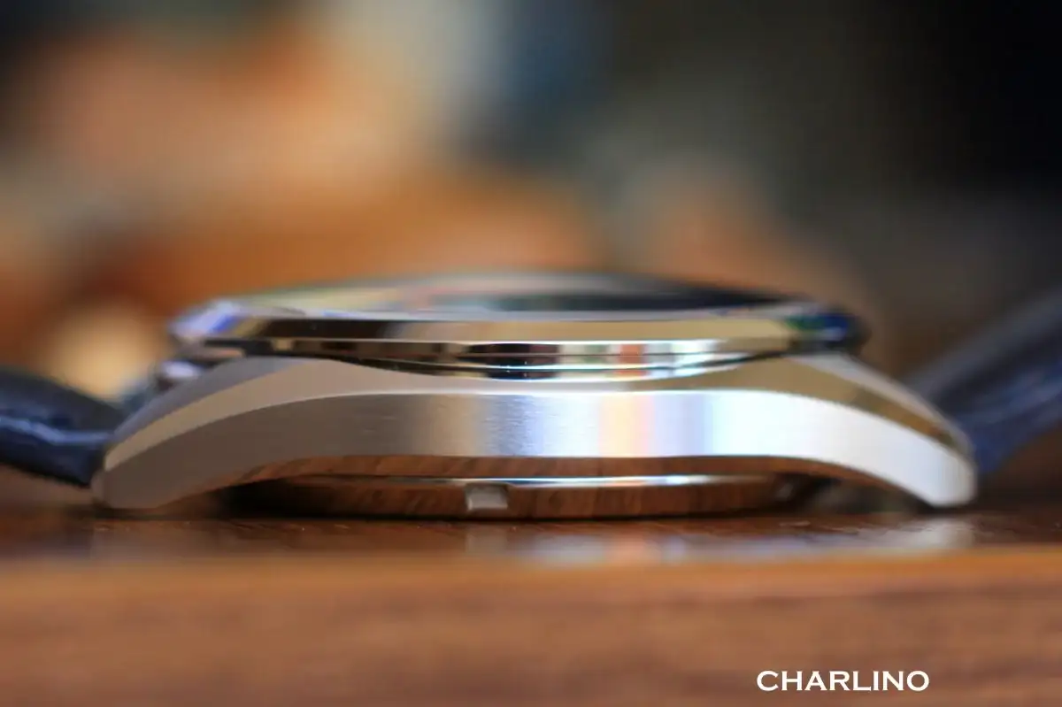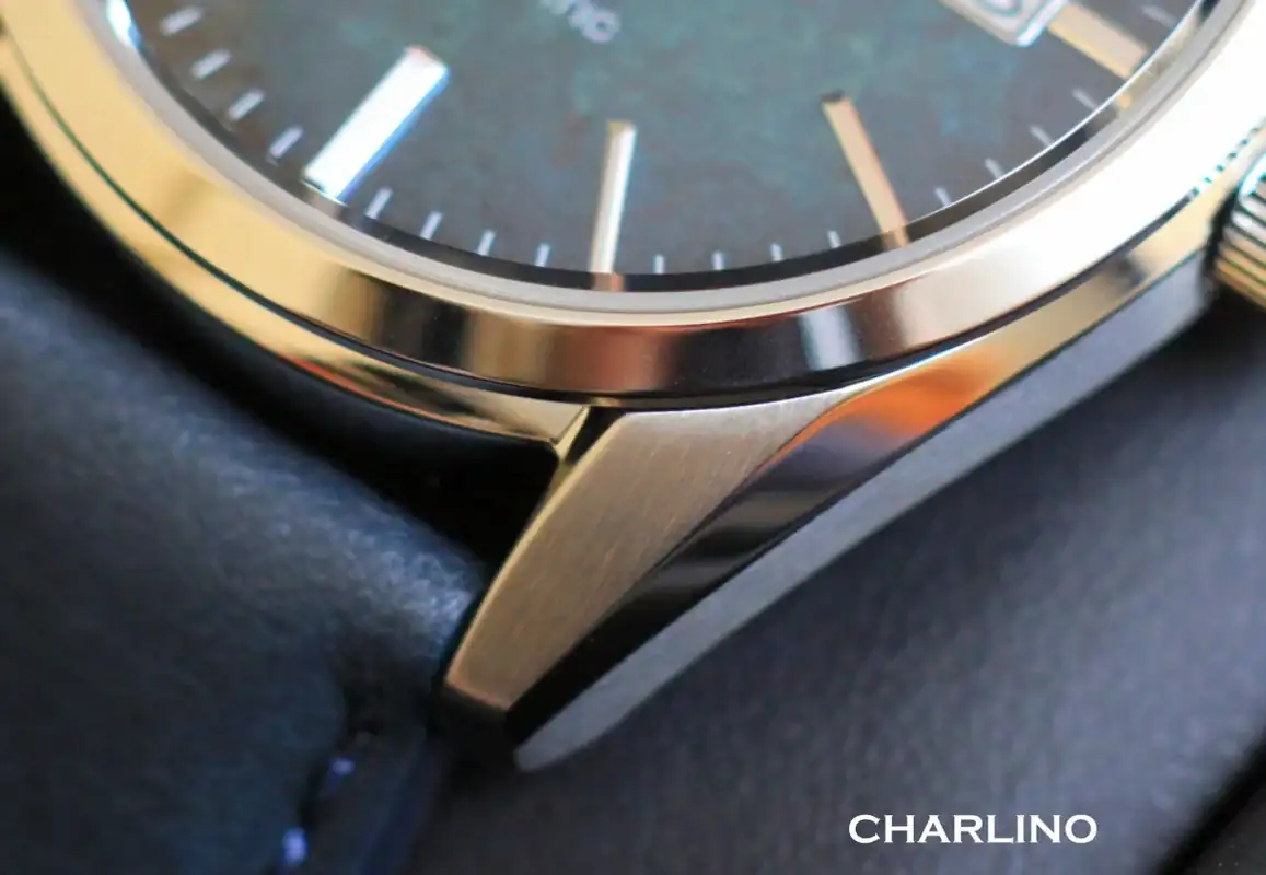 La caja también está muy bien hecha, con pulidos y satinados muy buenos y las transiciones entre los dos tipos de acabado son de las mejores que he visto. Es de acero Duratect, y con un tamaño muy elegante de alrededor de 38mm.