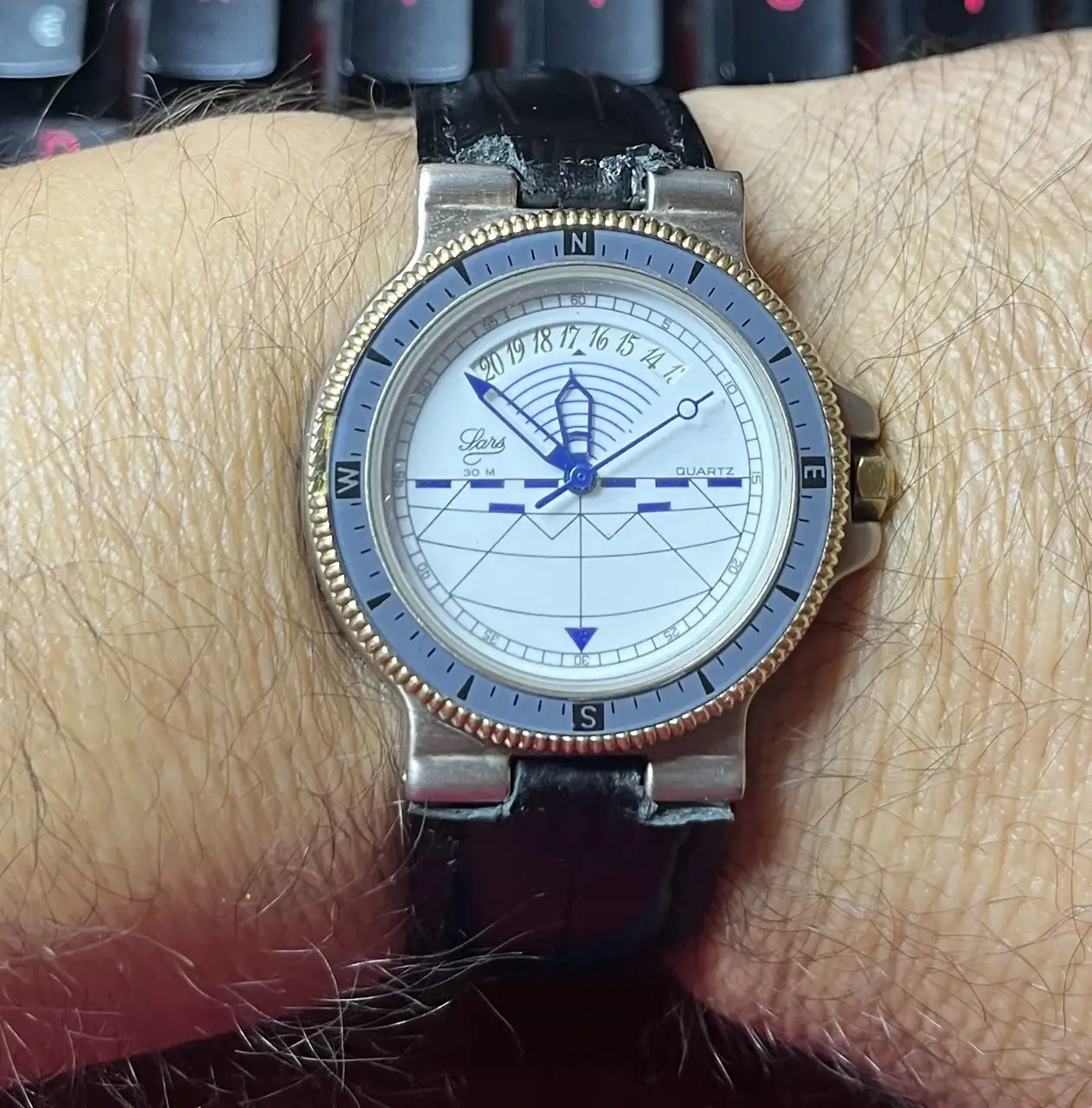De este reloj no se absolutamente nada. Lo compré en el mercachuflo este sábado pasado y he tenido que adaptarle una correa mediante artesanía de urgencia. No ha quedado muy bien, pero ya me está viniendo otra para perfeccionar la ñapa. Creo que no es más que una chinada chunga, pero me gusta mucho y esa es la base de mis relojes. Que me gusten. ¡Ah! Es un Lars. No pongan esa cara que yo también me he asustado. Un saludo y muchas gracias.