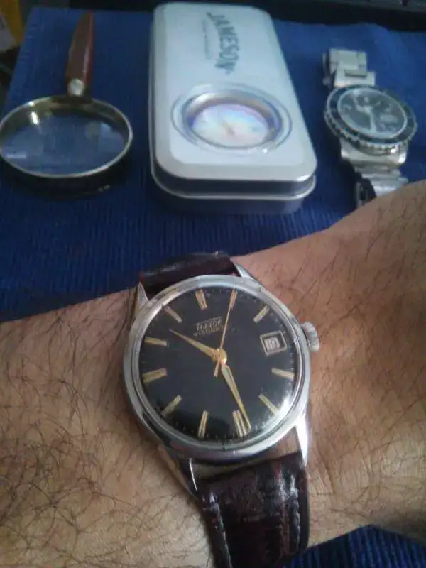 Y como he "fallado" algún, día también pongo la foto del "vintage" que me pondré por la tarde y que acaba de entrar en el jardín de mis delicias. Es uno de los primeros modelos de Visodate que sacó al mercado Tissot, si no me equivocó allá por el 55. Si alguno tiene alguna concreción al respecto del modelo, quedaré siempre agradecido. Ahí va el abuelo: