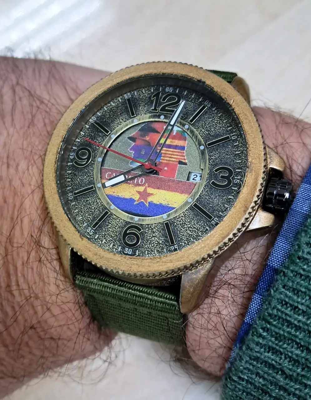Pues éste en concreto, es un reloj baratillo que me gustó la esfera. En el circulo central, le puse yo la decoración referente a la República Española, le pinté el segundero de rojo y ahora también recién pintada la caja con ese color como viejo que me ha gustado. Una correa de nylon verde militar y a funcionar!
