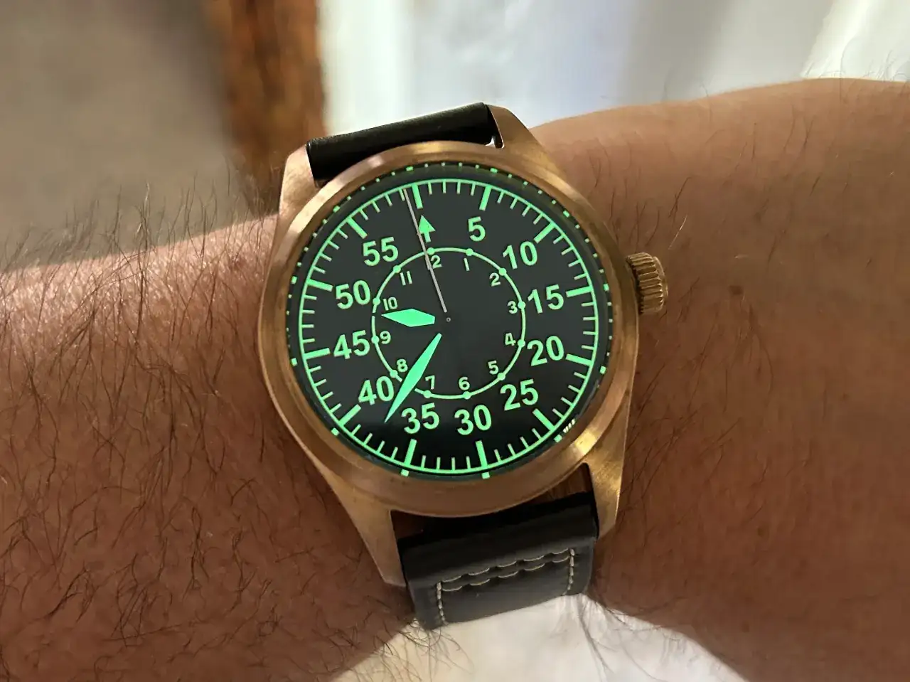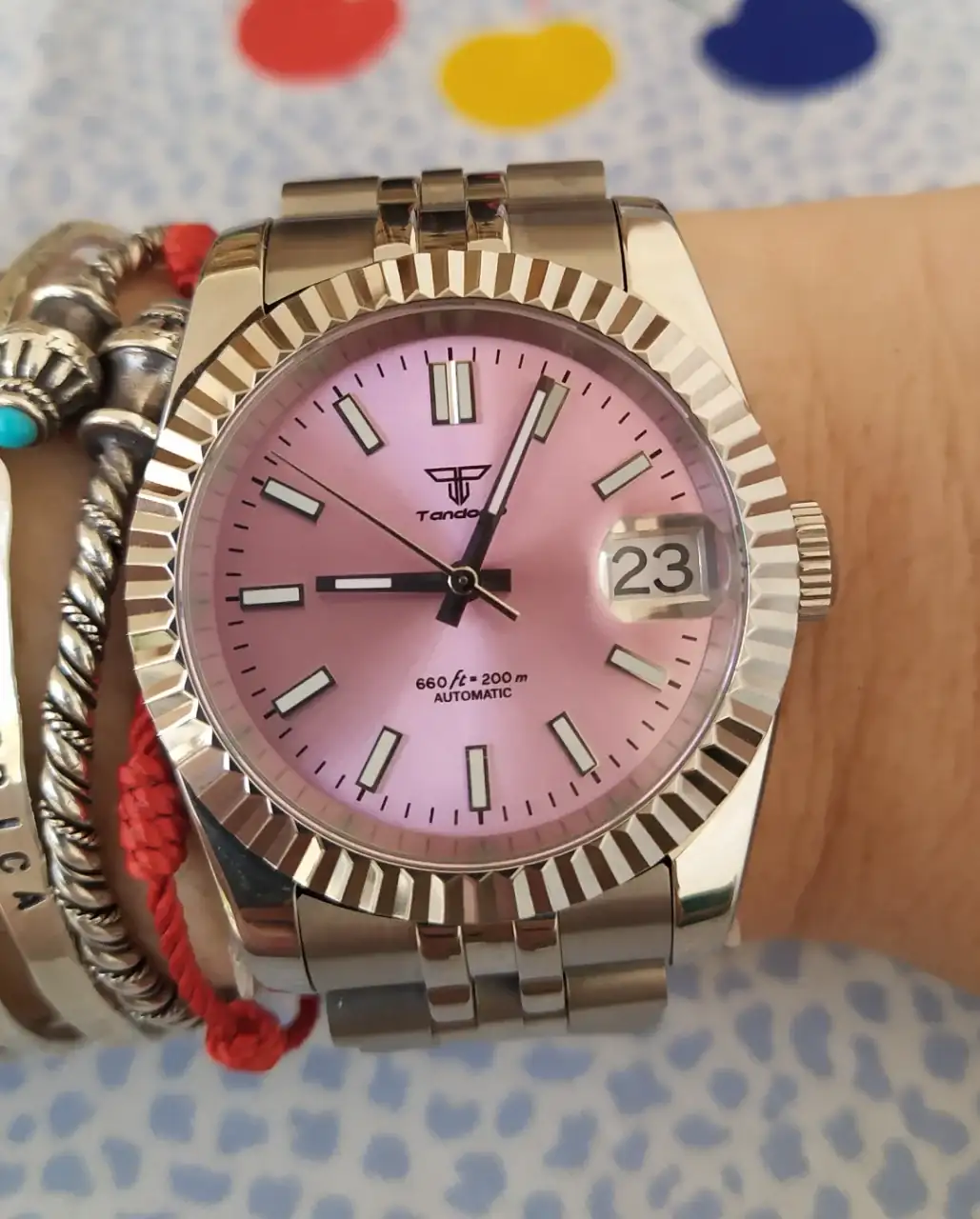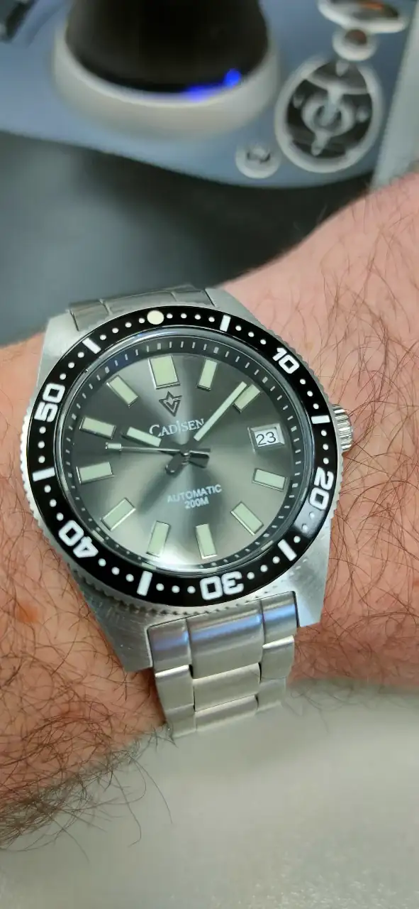 A mi también me sorprendió mucho.Tengo el mismo pero le puse una correa en tono gris . Un reloj y marca china que me sorprendió. Que tengas un buen día !.