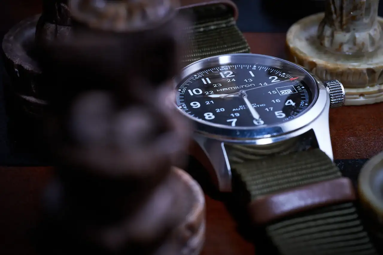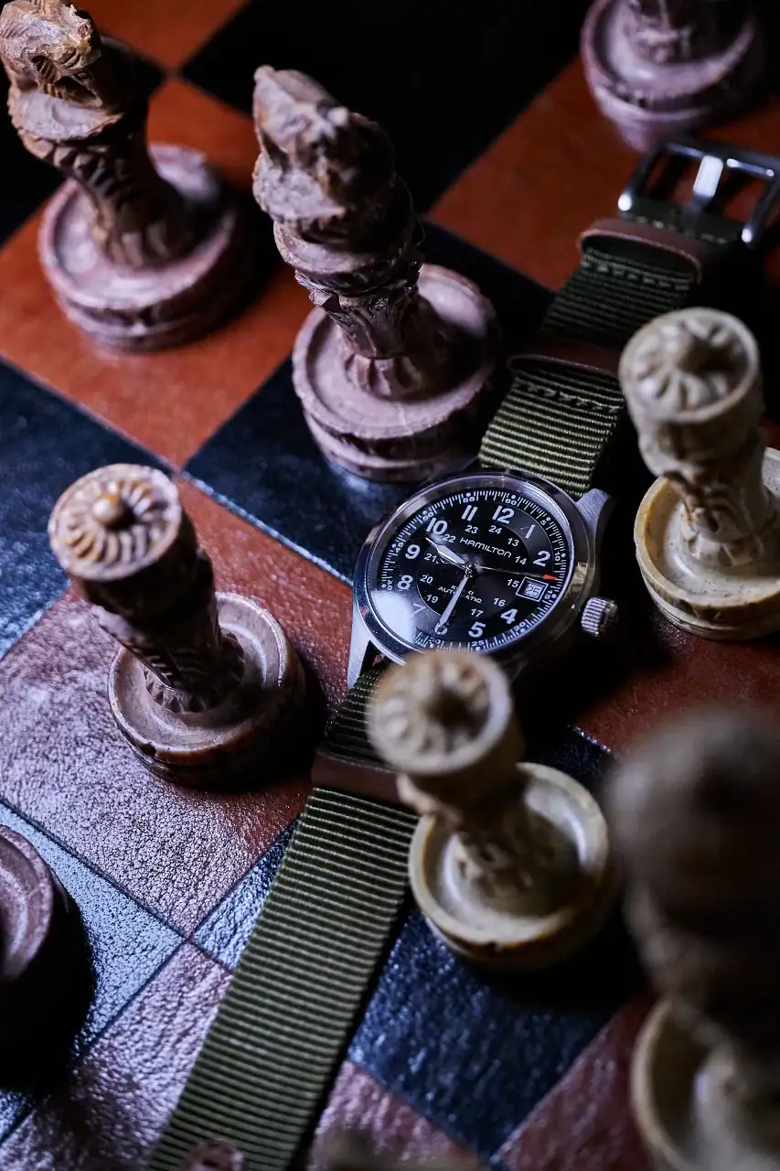 Bonitas fotos.Estrategia militar en la muñeca. Este Hamilton Khaki Field Mechanical ejecuta un jaque magistral sobre el tablero, entre alfiles de marfil y torres talladas.