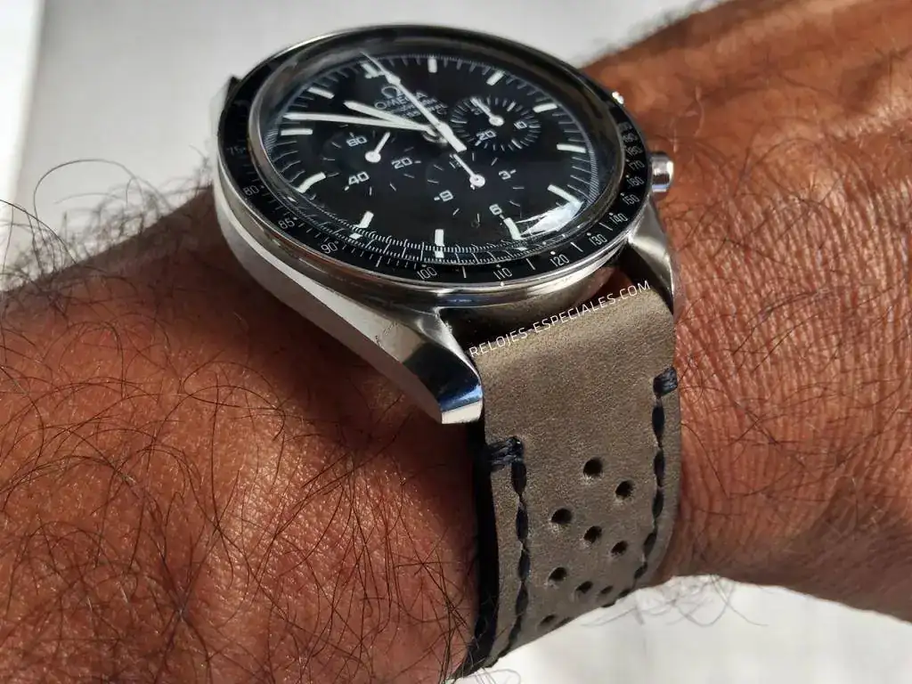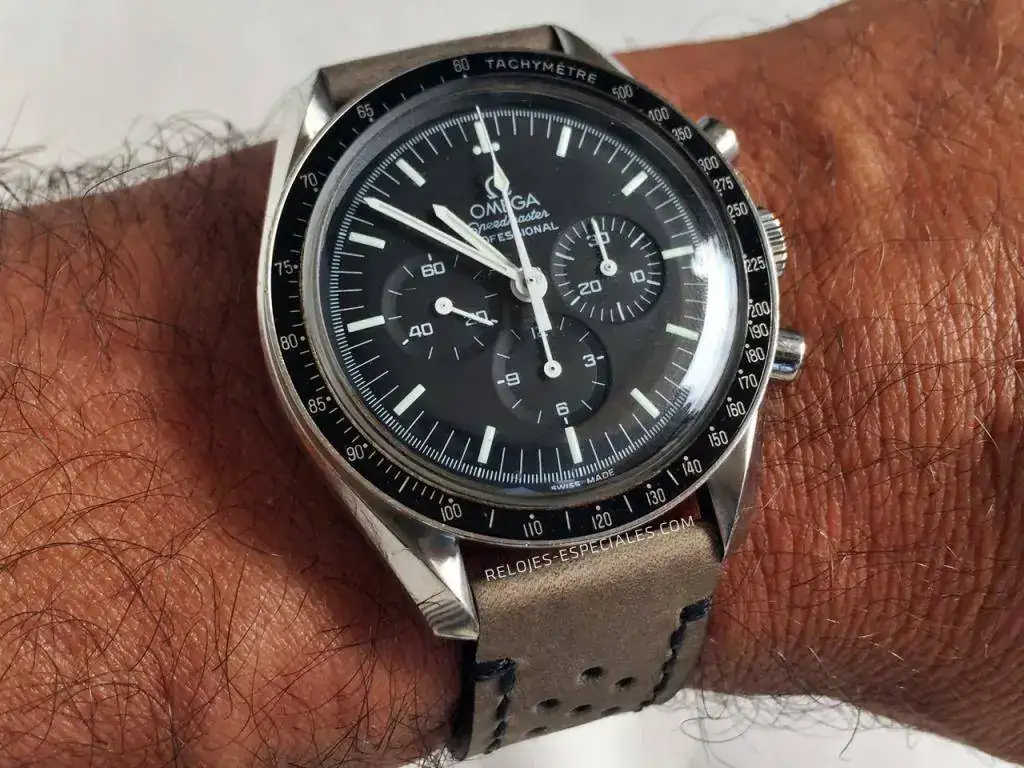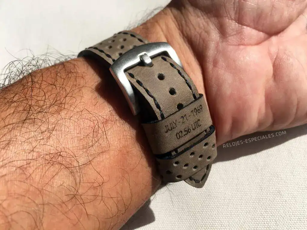 estoy como niño con zapatos (correa) nuevos/a. Acabo de calzarle esta chulada al Moon, que lleva la fecha y hora de alunizaje en la trabilla. Trabajazo de www.14-40.com
