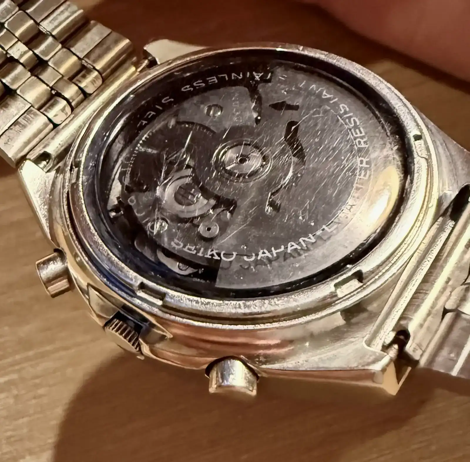 Discos transparentes (algo que se vio antes en el zodiac astrographic) para el día y fecha , kanji-ingles y fondo, también, transparente donde se puede ver su rotor negro pero como iba impreso, en el cristal, la información y el número de serie, en este caso se ha borrado con el uso por lo que no se puede saber la fecha de fabricación; aúnque estimo a finales de los 70.