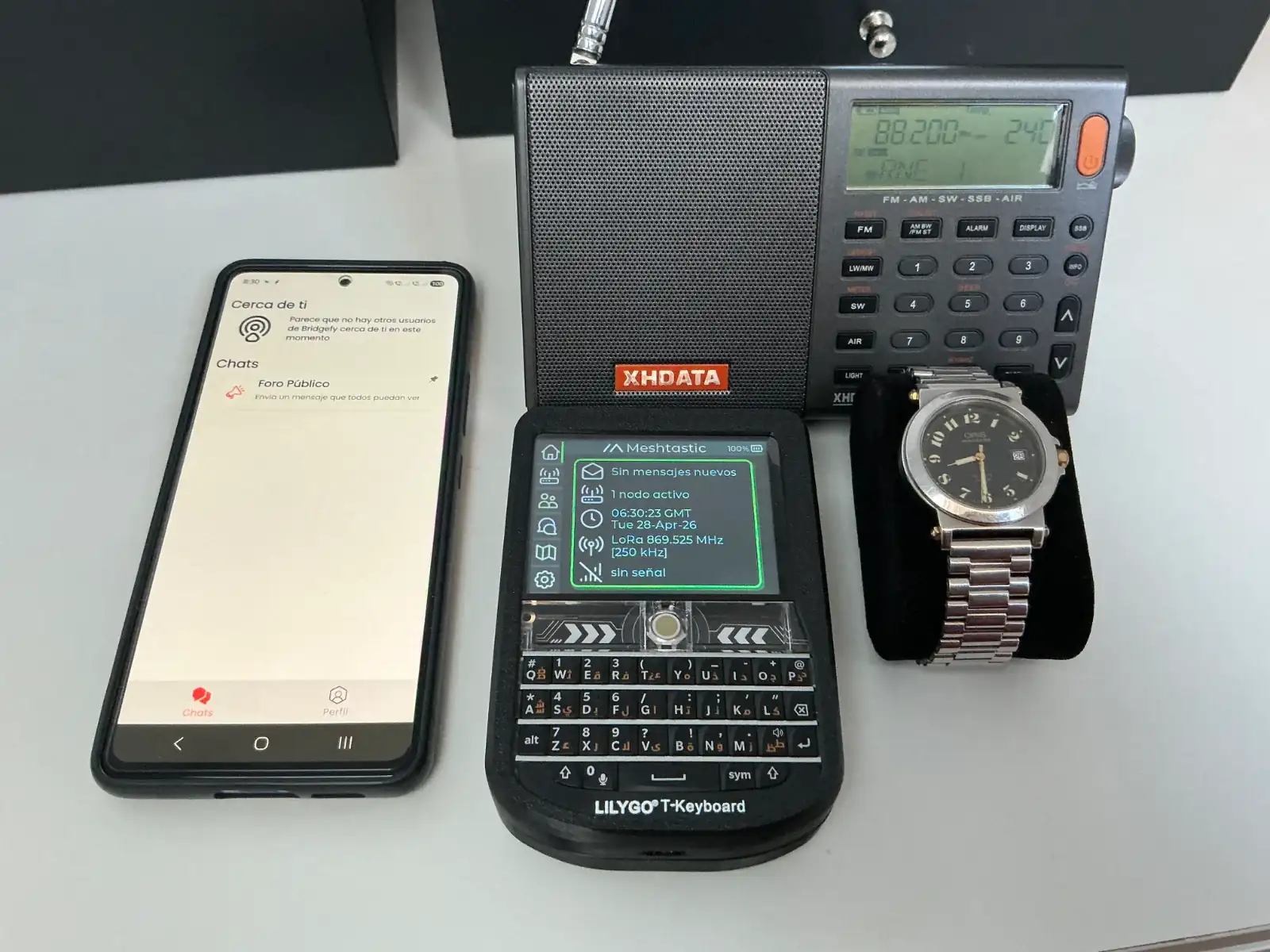 2.- LiLygo con Meshtastic, que unido a otro dispositivo LoRa sin pantalla que tengo en el tejado, me permitieron chatear con colegas de Madrid.
