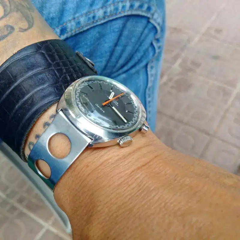 Precioso y "atrevido" con el armis del PR.yo hoy llevaré este omega "del doctor" en plan canalla, por el brazalete de cuero que comparte muñeca y el armys heritage rally de aquel tissot pr516 gl