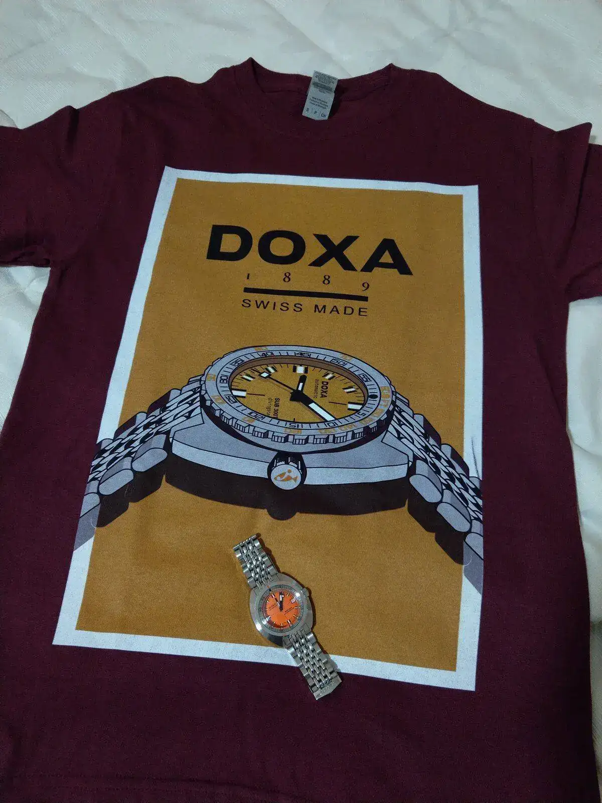 Bonita camiseta, a juego con el reloj. jeje 😉Buenas noches a todos. Aquí sigo con mi Doxa, y una camiseta que me ha llegado hoy. Deseando que llegue el buen tiempo para ponérmela...